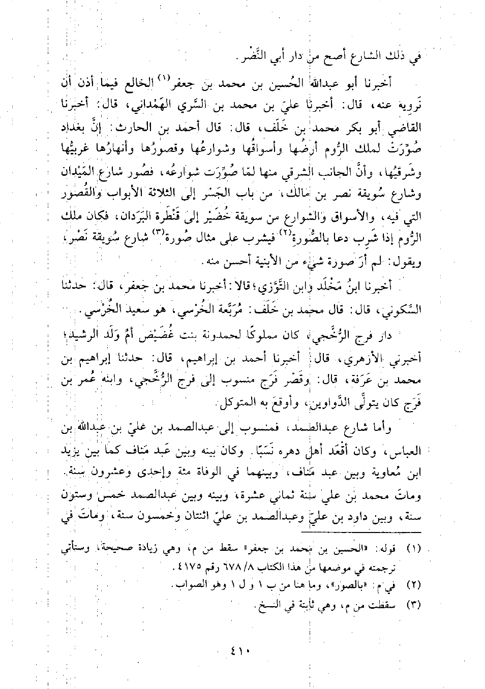 أَخْبَرَنَا أَبُو عَبْد الله الحسين بْن مُحَمَّد بْن جعفر الخالع، فيما أذن أن نرويه عنه، قَالَ: أَخبرنا عَلِيّ بْن مُحَمَّد بْن السري الهمداني، قَالَ: أَخبرنا الْقَاضِي أَبُو بكر مُحَمَّد بْن خلف، قَالَ: قَالَ أَحْمَد بْن الحارث: إن بغداد صورت لملك الروم أرضها وأسواقها وشوارعها وقصورها وأنهارها غربيها وشرقيها، وأن الجانب الشرقي منها لما صورت شوارعه، فصور شارع الميدان وشارع سويقة نصر بْن مالك، من باب الجسر إِلَى الثلاثة الأبواب والقصور التي فيه، والأسواق والشوارع من سويقة خضير إِلَى قنطرة البردان، فكان ملك الروم إذا شرب دعا بالصورة، فيشرب على مثال صورة شارع سويقة نصر، ويقول: لم أر صورة شيء من الأبنية أحسن منه.