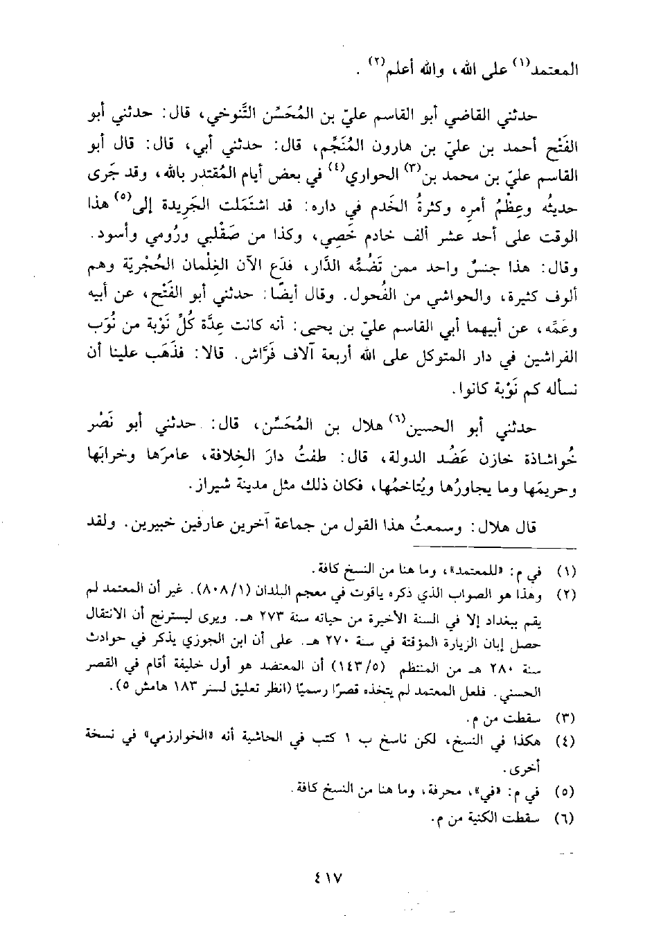 حَدَّثَنِي أَبُو الحسين هلال بْن المحسن، قَالَ: حَدَّثَنِي أَبُو نصر خواشاذة خازن عضد الدولة، قَالَ: طفت دار الخلافة، عامرها وخرابها وحريمها، وما يجاورها ويتاخمها، فكان ذلك مثل مدينة شيراز.