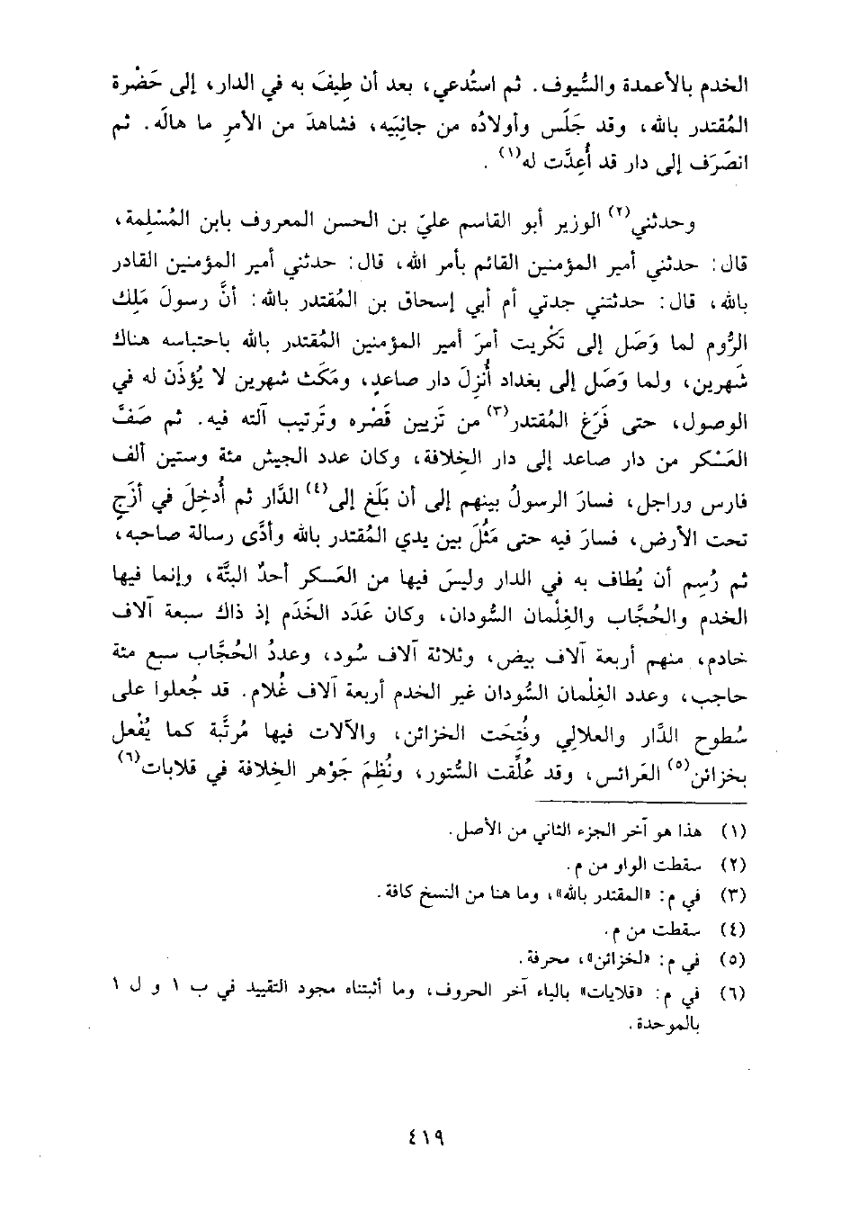 ثم صف العسكر من دار صاعد إِلَى دار الخلافة، وكان عدد الجيش مائة وستين ألف فارس وراجل، فسار الرسول بينهم إِلَى أن بلغ الدار ثم أدخل في أزج تحت الأرض، فسار فيه حتى مثل بين يدي المقتدر بالله وأدى رسالة صاحبه، ثم رسم أن يطاف به في الدار وليس فيها من العسكر أحد ألبتة، وإنما فيها الخدم والحجاب والغلمان السودان، وكان عدد الخدم إذ ذاك سبعة آلاف خادم، منهم أربعة آلاف بيض، وثلاثة آلاف سود، وعدد الحجاب سبع مائة حاجب، وعدد الغلمان السودان غير الخدم أربعة آلاف غلام.