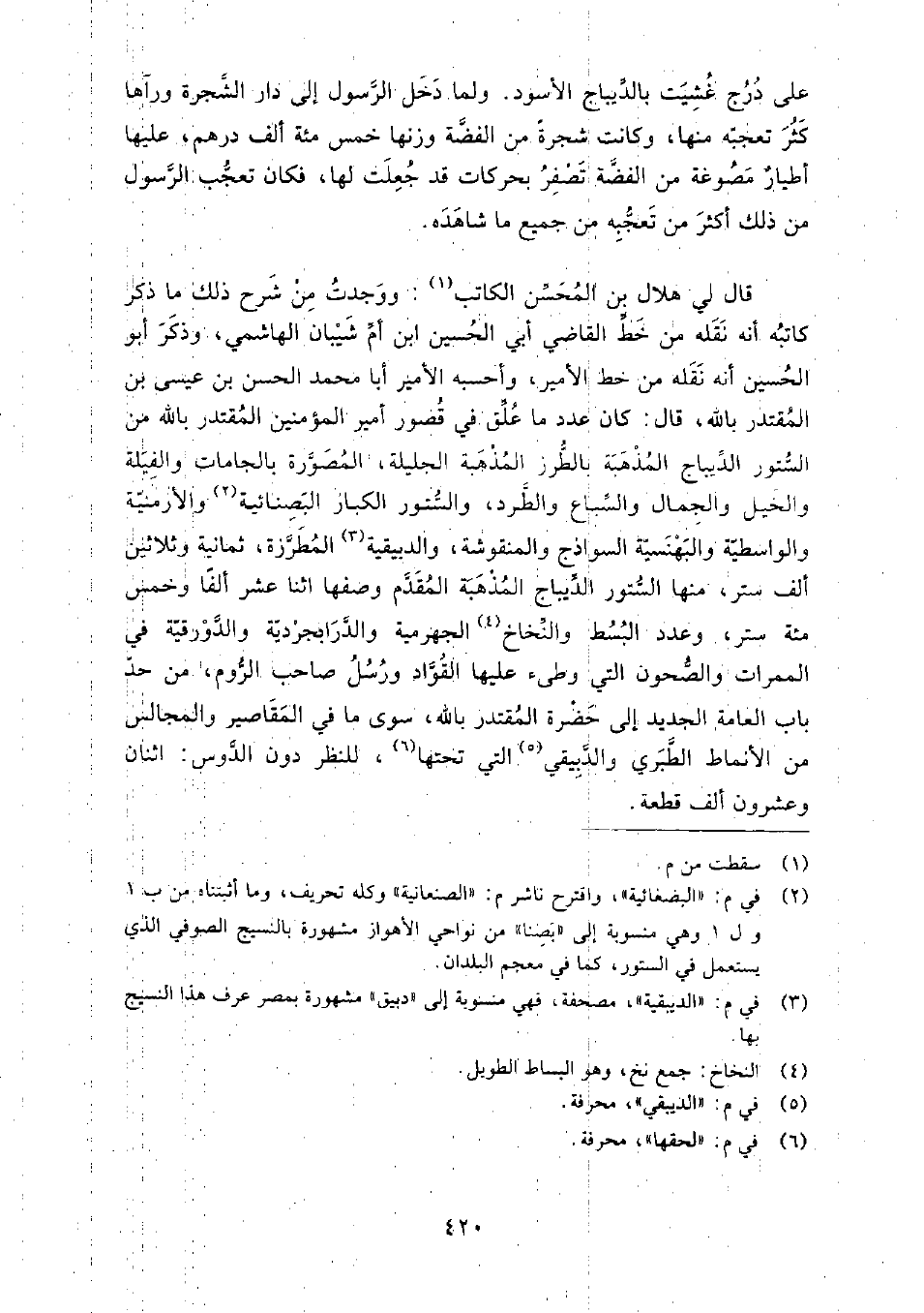 قَالَ لي هلال بْن المحسن الكاتب: ووجدت من شرح ذلك ما ذكر كاتبه أنه نقله من خط الْقَاضِي أَبِي الحسين ابْن أم شيبان الهاشمي، وذكر أَبُو الحسين أنه نقله من خط الأمير، وأحسبه الأمير أبا مُحَمَّد الْحَسَن بْن عِيسَى بْن المقتدر بالله، قَالَ: كان عدد ما علق في قصور أمير المؤمنين المقتدر بالله من الستور الديباج المذهبة بالطرز المذهبة الجليلة، المصورة بالجامات والفيلة والخيل والجمال والسباع والطرد، والستور الكبار البصنائية والأرمنية والواسطية والبهنسية السواذج والمنقوشة، والديبقية المطرزة، ثمانية وثلاثين ألف ستر، منها الستور الديباج المذهبة المقدم وصفها اثنا عشر ألفا وخمس مائة ستر، وعدد البسط والنخاخ الجهرمية والدارابجردية والدورقية في الممرات والصحون التي وطئ عليها القواد ورسل صاحب الروم، من حد باب العامة الجديد إِلَى حضرة المقتدر بالله، سوى ما في المقاصير والمجالس من الأنماط الطبري والديبقي التي تحتها، للنظر دون الدوس: اثنان وعشرون ألف قطعة.