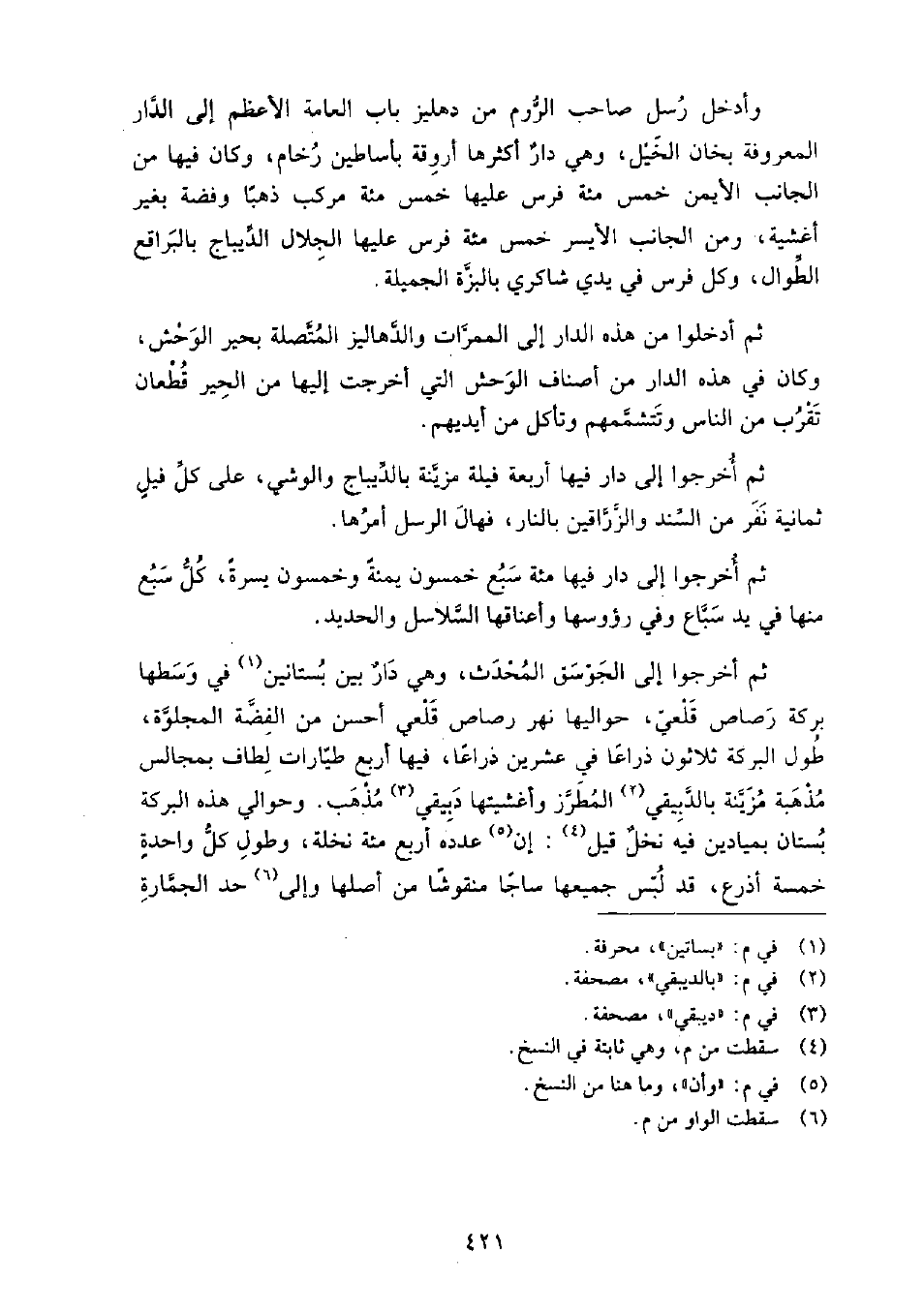 وأدخل رسل صاحب الروم من دهليز باب العامة الأعظم إِلَى الدار المعروفة بخان الخيل، وهي دار أكثرها أروقة بأساطين رخام، وكان فيها من الجانب الأيمن خمس مائة فرس عليها خمس مائة مركب ذهبا وفضة بغير أغشية، ومن الجانب الأيسر خمس مائة فرس عليها الجلال الديباج بالبراقع الطوال، وكل فرس في يدي شاكري بالبزة الجميلة.