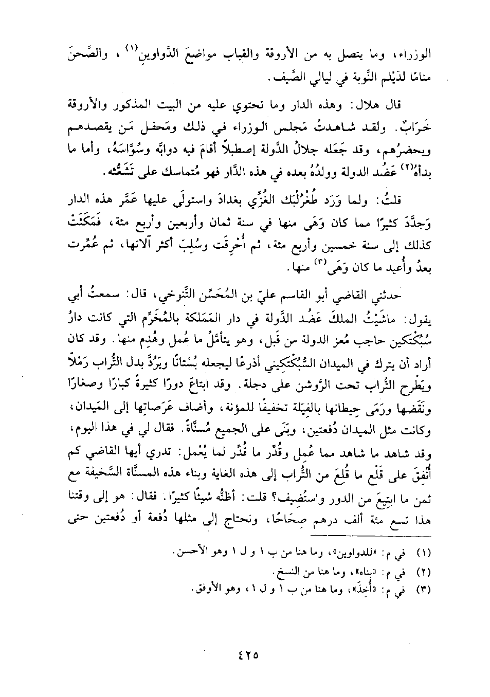 ولقد شاهدت مجلس الوزراء في ذلك ومحفل من يقصدهم ويحضرهم، وقد جعله جلال الدولة اصطبلا أقام فيه دوابه وسواسه، وأما ما بدأه عضد الدولة وولده بعده في هذه الدار فهو متماسك على تشعثه.