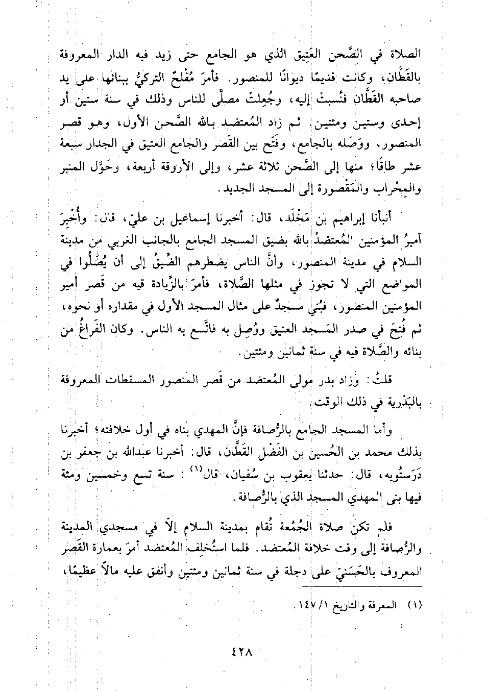 وأما المسجد الجامع بالرصافة فإن المهدي بناه في أول خلافته، أَخْبَرَنَا بذلك مُحَمَّد بْن الحسين بْن الفضل القطان، قَالَ: أَخبرنا عَبْدُ الله بْن جعفر بْن درستويه، قَالَ: حَدَّثَنَا يعقوب بْن سفيان، قَالَ: سنة تسع وخمسين ومائة فيها بنى المهدي المسجد الذي بالرصافة.