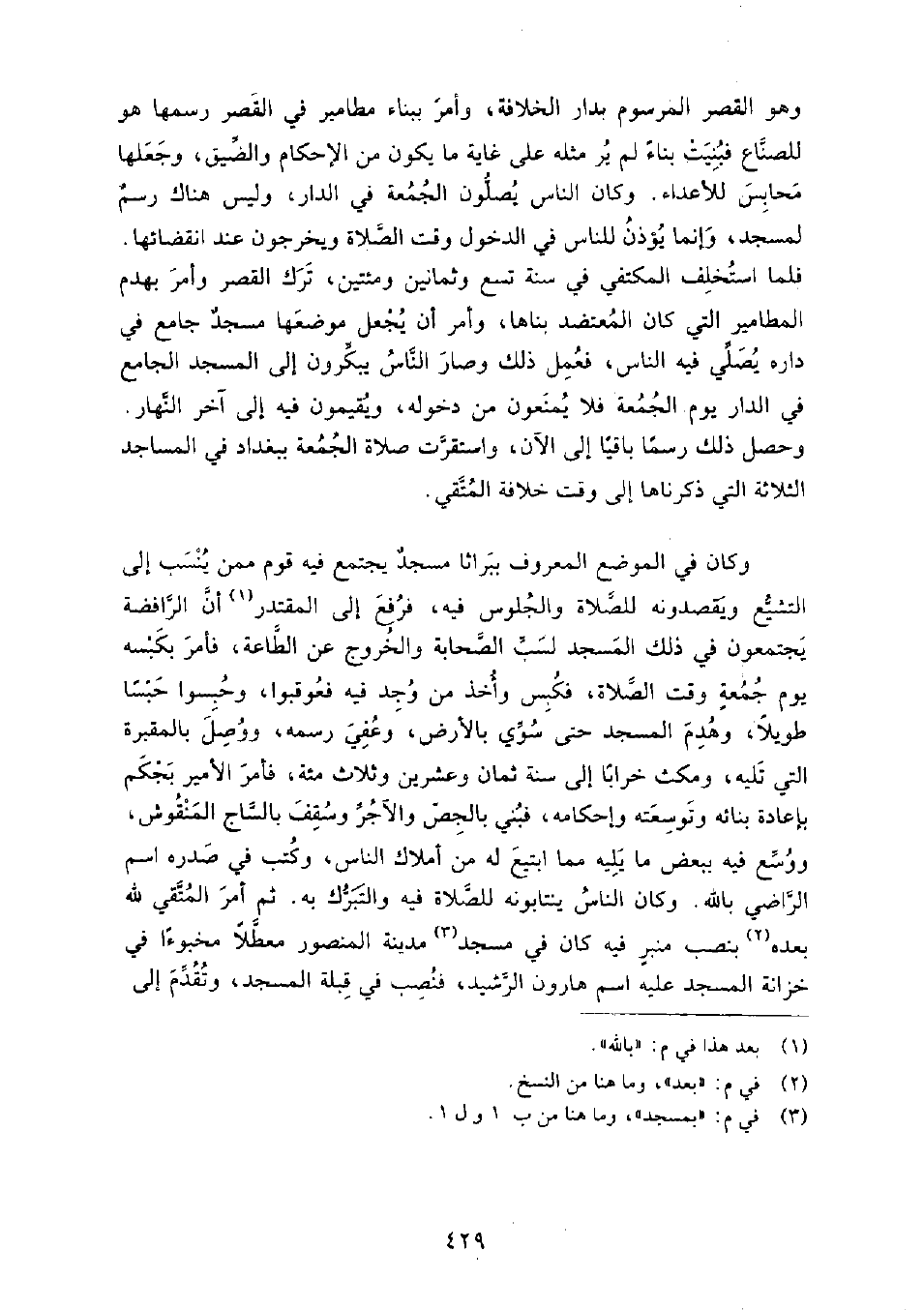 وحصل ذلك رسما باقيا إِلَى الآن، واستقرت صلاة الجمعة ببغداد في المساجد الثلاثة التي ذكرناها إِلَى وقت خلافة المتقي.