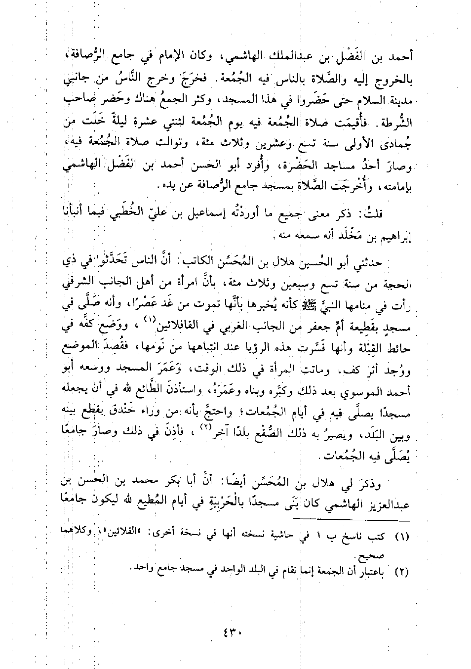 وَحَدَّثَنِي أَبُو الحسين هلال بْن المحسن الكاتب، أن الناس تحدثوا في ذي الحجة من سنة تسع وسبعين وثلاث مائة، بأن امرأة من أهل الجانب الشرقي رأت في منامها النبي صَلَّى اللَّهُ عَلَيْهِ وَسَلَّمَ كأنه يخبرها بأنها تموت من غد عصرا، وأنه صلى في مسجد بقطيعة أم جعفر من الجانب الغربي في القافلائين، ووضع كفه في حائط القبلة، وأنها فسرت هذه الرؤيا عند انتباهها من نومها، فقصد الموضع ووجد أثر كف، وماتت المرأة في ذلك الوقت، وعمر المسجد ووسعه أَبُو أَحْمَد الموسوي بعد ذلك وكبره وبناه وعمره، واستأذن الطائع لله في أن يجعله مسجدا يصلى فيه في أيام الجمعات، واحتج بأنه من وراء خندق يقطع بينه وبين البلد، ويصير به ذلك الصقع بلدا آخر، فأذن في ذلك وصار جامعا يصلى فيه الجمعات.