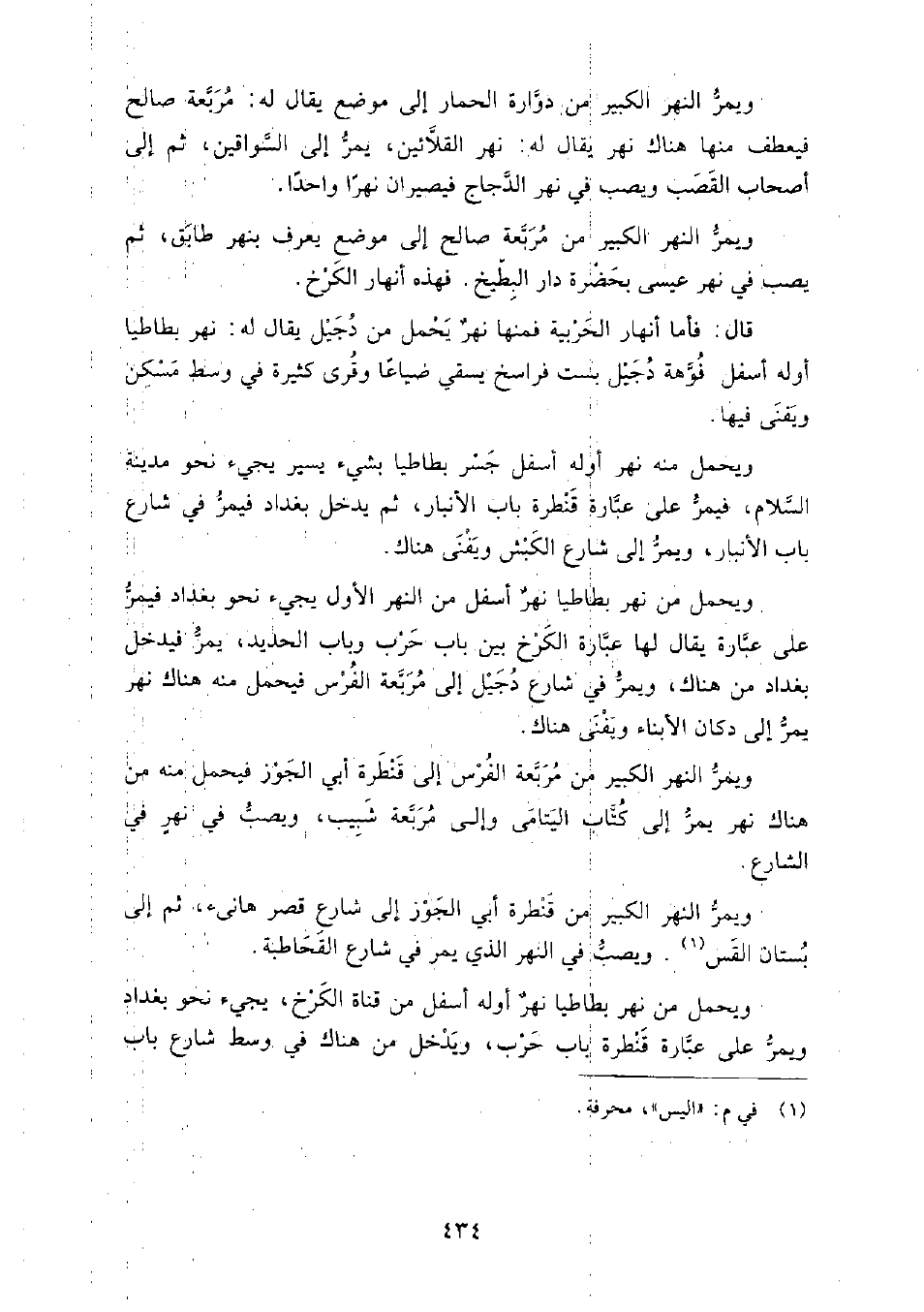قَالَ: فأما أنهار الحربية فمنها نهر يحمل من دجيل يقال له: نهر بطاطيا أوله أسفل فوهة دجيل بست فراسخ، يسقي ضياعا وقرى كثيرة في وسط مسكن ويفنى فيها.