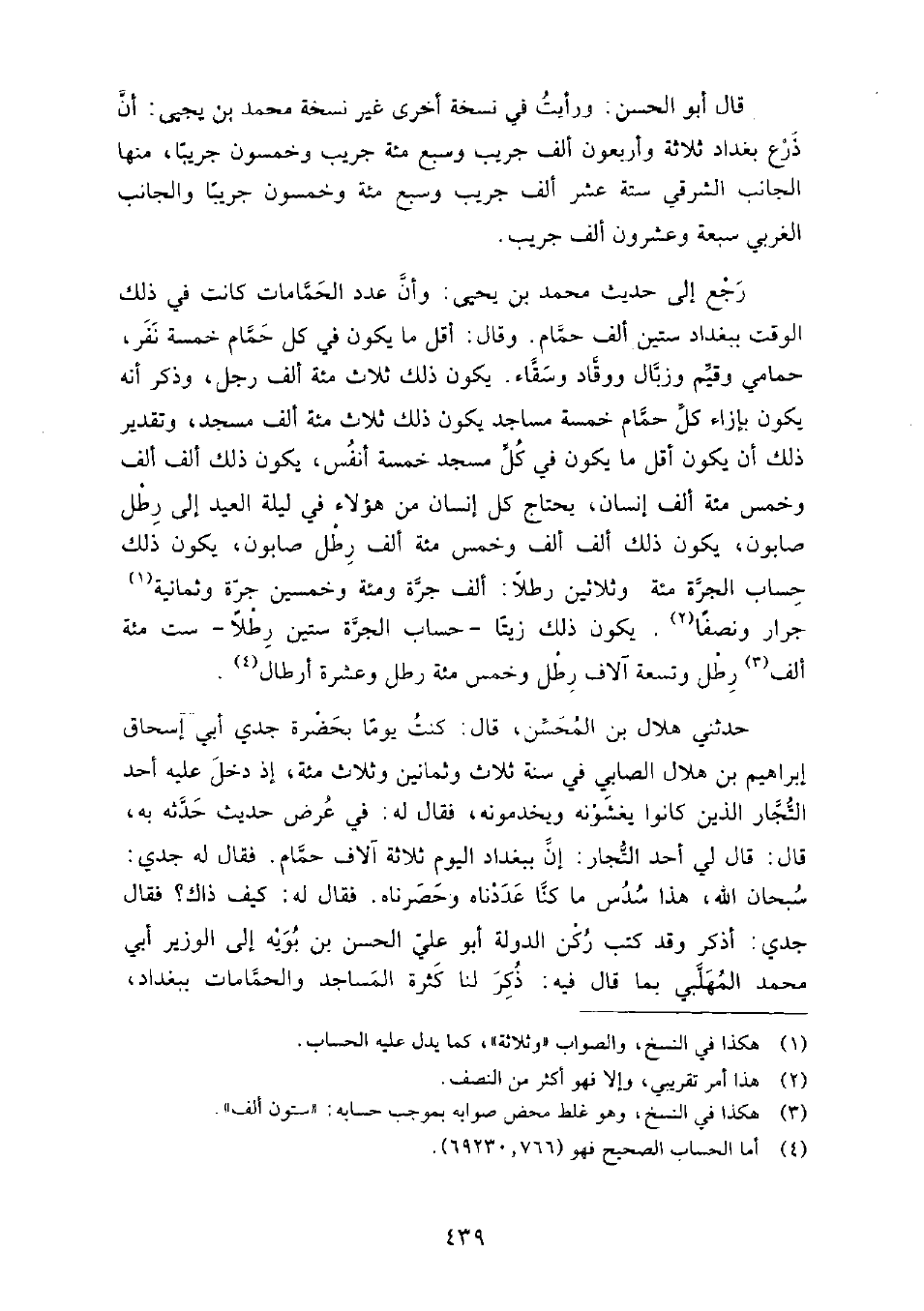 رجع إِلَى حديث مُحَمَّد بْن يَحْيَى: وأن عدد الحمامات كانت في ذلك الوقت ببغداد ستين ألف حمام.