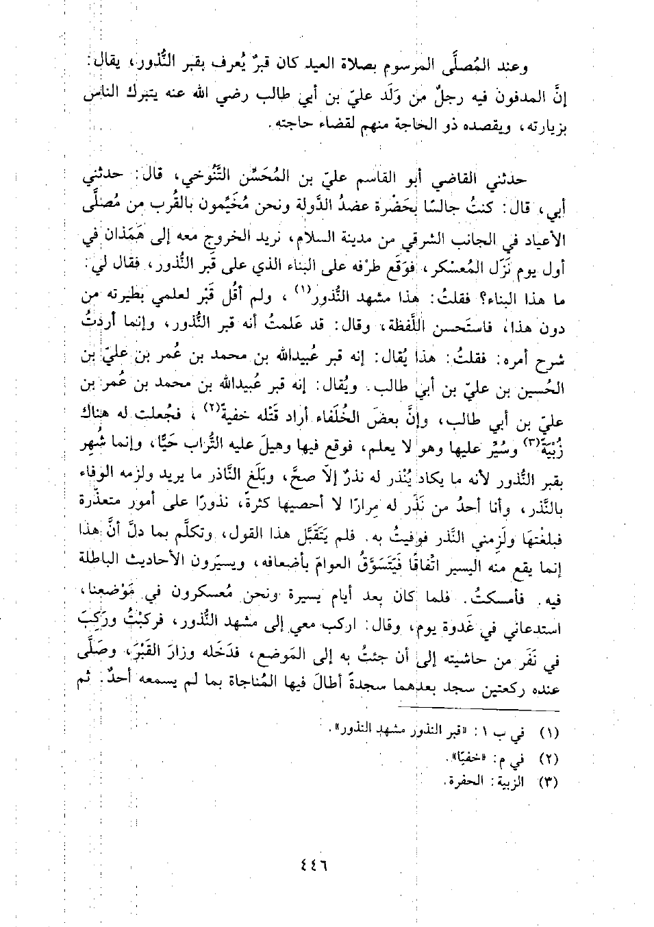 حَدَّثَنِي الْقَاضِي أَبُو القاسم عَلِيّ بْن المحسن التنوخي، قَالَ: حَدَّثَنِي أَبِي، قَالَ: كنت جالسا بحضرة عضد الدولة ونحن مخيمون بالقرب من مصلى الأعياد في الجانب الشرقي من مدينة السلام، نريد الخروج معه إِلَى همذان في أول يوم نزل المعسكر، فوقع طرفه على البناء الذي على قبر النذور، فقال لي: ما هذا البناء؟ فقلت: هذا مشهد النذور، ولم أقل قبر لعلمي بطيرته من دون هذا، فاستحسن اللفظة، وَقَالَ: قد علمت أنه قبر النذور، وإنما أردت شرح أمره.