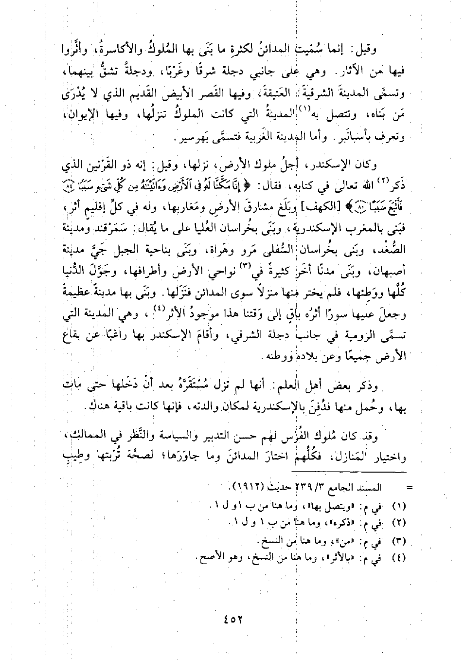 وكان الإسكندر أجل ملوك الأرض، نزلها، وقيل: إنه ذو القرنين الذي ذكر الله تعالى في كتابه، فقال: {إِنَّا مَكَّنَّا لَهُ فِي الأَرْضِ وَآتَيْنَاهُ مِنْ كُلِّ شَيْءٍ سَبَبًا} الكهف، وبلغ مشارق الأرض ومغاربها، وله في كل إقليم أثر، فبنى بالمغرب الإسكندرية، وبنى بخراسان العليا على ما يقال: سمرقند ومدينة الصغد، وبنى بخراسان السفلى مرو وهراة، وبنى بناحية الجبل جي مدينة أصبهان، وبنى مدنا أخر كثيرة من نواحي الأرض وأطرافها، وجول الدنيا كلها ووطئها، فلم يختر منها منزلا سوى المدائن فنزلها.
