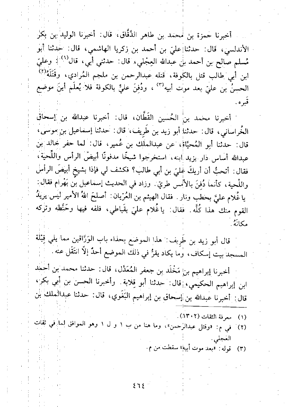 أَخْبَرَنَا حمزة بْن مُحَمَّد بْن طاهر الدقاق، قَالَ: أَخبرنا الوليد بْن بكر الأندلسي، قَالَ: حَدَّثَنَا عَلِيّ بْن أَحْمَد بْن زكريا الهاشمي، قَالَ: حَدَّثَنَا أَبُو مسلم صالح بْن أَحْمَد بْن عَبْدِ اللَّهِ العجلي، قَالَ: حَدَّثَنِي أَبِي، قَالَ: وعلي بْن أَبِي طالب، قتل بالكوفة قتله عَبْد الرَّحْمَنِ بْن ملجم المرادي، وقتله الْحَسَن بْن عَلِيّ، بعد موت أبيه، ودفن عَلِيّ بالكوفة فلا يعلم أين موضع قبره.