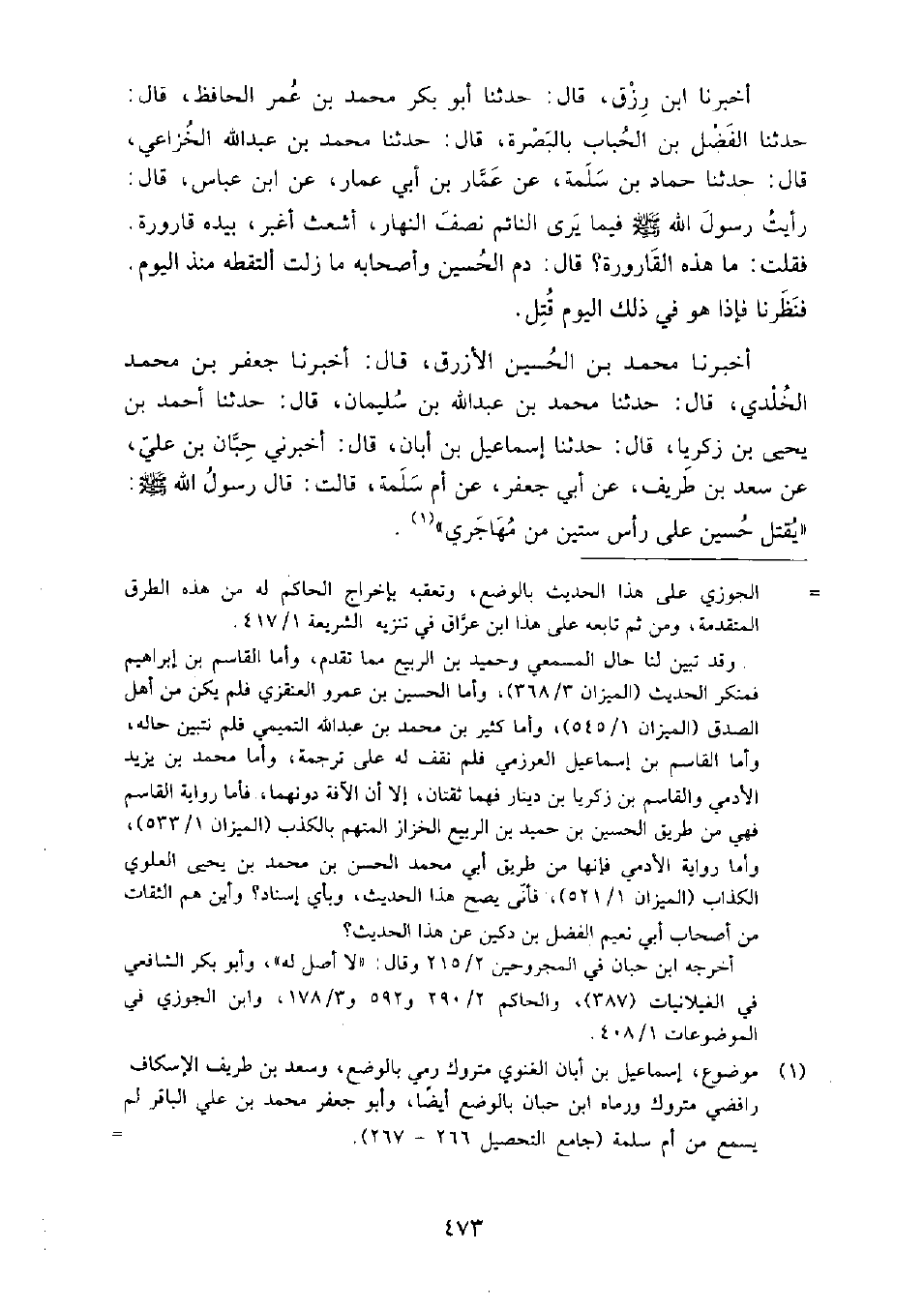 (77) أَخْبَرَنَا ابْنُ رِزْقٍ، قَالَ: حَدَّثَنَا أَبُو بَكْرٍ مُحَمَّدُ بْنُ عُمَرَ الْحَافِظُ، قَالَ حَدَّثَنَا الْفَضْلُ بْنُ الْحُبَابِ، بِالْبَصْرَةِ، قَالَ حَدَّثَنَا مُحَمَّدُ بْنُ عَبْدِ اللَّهِ الْخُزَاعِيُّ، قَالَ: حَدَّثَنَا حَمَّادُ بْنُ سَلَمَةَ، عَنْ عَمَّارِ بْنِ أَبِي عَمَّارٍ، عَنِ ابْنِ عَبَّاسٍ، قَالَ: " رَأَيْتُ رَسُولَ اللَّهِ صَلَّى اللَّهُ عَلَيْهِ وَسَلَّمَ فِيَمَا يَرَى النَّائِمُ نِصْفَ النَّهَارِ أَشْعَثَ أَغْبَرَ، بِيَدِهِ قَارُورَةٌ، فَقُلْتُ: مَا هَذِهِ الْقَارُورَةُ؟ قَالَ: " دَمُ الْحُسَيْنِ وَأَصْحَابُهُ، مَا زِلْتُ أَلْتَقِطُهُ مُنْذُ الْيَوْمِ "، فَنَظَرْنَا فَإِذَا هُوَ فِي ذَلِكَ الْيَوْمَ قُتِلَ