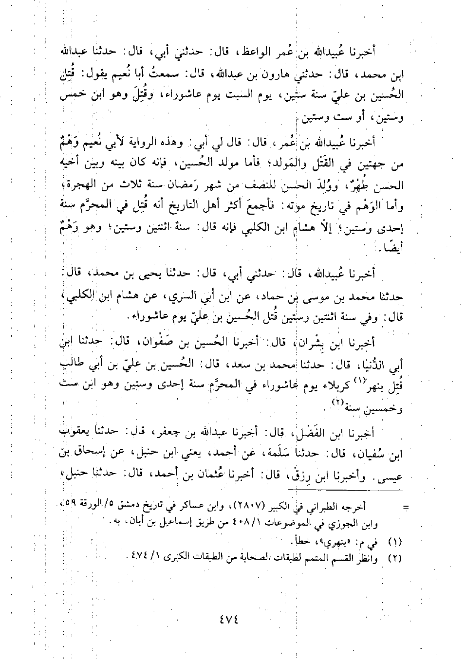 أَخْبَرَنَا عبيد الله، قَالَ: حَدَّثَنِي أَبِي، قَالَ: حَدَّثَنَا يَحْيَى بْن مُحَمَّد، قَالَ: حَدَّثَنَا مُحَمَّدُ بْنُ مُوسَى بْن حماد، عَنِ ابْن أَبِي السري، عَنْ هشام ابْن الكلبي، قَالَ: وفي سنة اثنتين وستين قتل الحسين بْن عَلِيّ يوم عاشوراء أَخْبَرَنَا ابْن بشران، قَالَ: أَخبرنا الحسين بْن صفوان، قَالَ: حَدَّثَنَا ابْن أَبِي الدنيا، قَالَ: حَدَّثَنَا مُحَمَّدُ بْنُ سعد، قَالَ: الحسين بْن عَلِيّ بْن أَبِي طالب قتل بنهر كربلاء يوم عاشوراء في المحرم سنة إحدى وستين، وهو ابْن ست وخمسين سنة