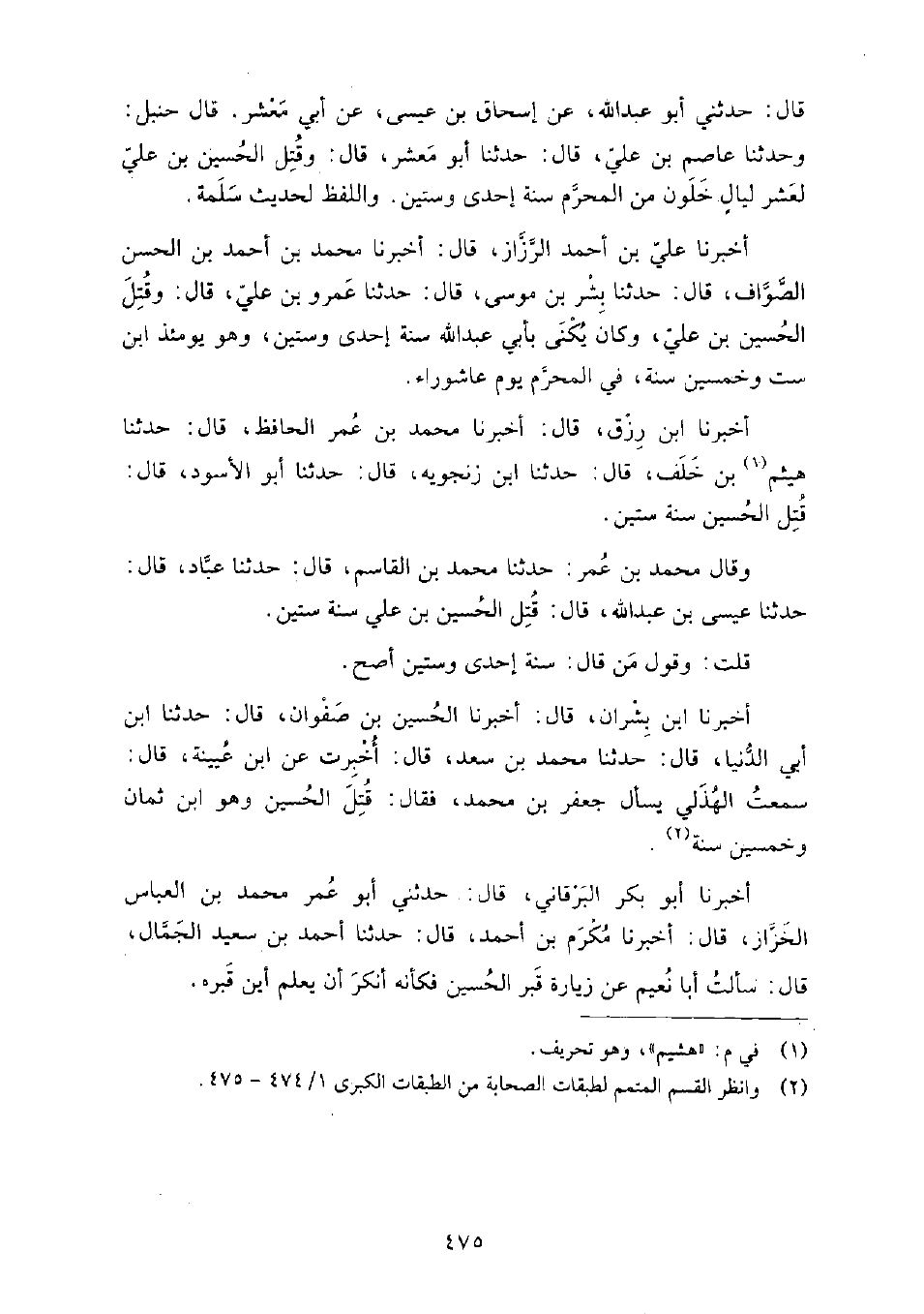 قَالَ: حَدَّثَنِي أَبُو عَبْد الله، عَنْ إِسْحَاق بْن عِيسَى، عَنْ أَبِي معشر، قَالَ حَنْبَل: وَحَدَّثَنَا عاصم بْن عَلِيّ، قَالَ: حَدَّثَنَا أَبُو معشر، قَالَ: وقتل الحسين بْن عَلِيّ لعشر ليال خلون من المحرم سنة إحدى وستين.