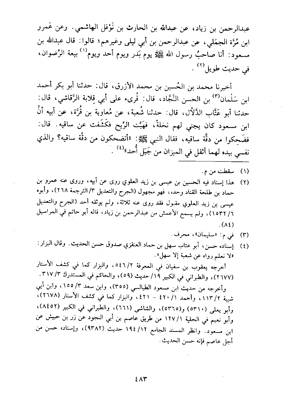 قَالَ: فَضَحِكُوا مِنْ دِقَّةِ سَاقَيْهِ، فَقَالَ النَّبِيُّ صَلَّى اللَّهُ عَلَيْهِ وَسَلَّمَ: " أَتَضْحَكُونَ مِنْ دِقَّةِ سَاقَيْهِ؟ وَالَّذِي نَفْسِي بِيَدِهِ لَهُمَا أَثْقَلُ فِي الْمِيزَانِ مِنْ جَبَلِ أُحُدٍ "