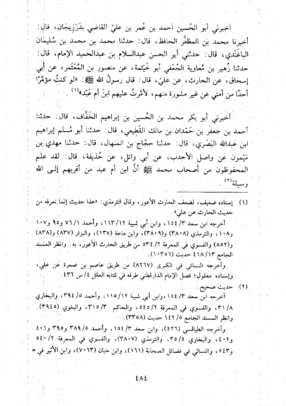 (86) -[1: 484] أَخْبَرَنِي أَبُو الْحُسَيْنِ أَحْمَدُ بْنُ عُمَرَ بْنِ عَلِيٍّ الْقَاضِي بَدرْزِيجَانَ، قَالَ: أَخْبَرَنَا مُحَمَّدُ بْنُ الْمُظَفَّرِ الْحَافِظُ، قَالَ: حَدَّثَنَا مُحَمَّدُ بْنُ مُحَمَّدِ بْنِ سُلَيْمَانَ الْبَاغَنْدِيُّ، حَدَّثَنِي أَبُو الْحَسَنِ عَبْدُ السَّلامِ بْنُ عَبْدِ الْحَمِيدِ الإِمَامُ، قَالَ: حَدَّثَنَا زُهَيْرُ بْنُ مُعَاوِيَةَ الْجُعْفِيُّ أَبُو خَيْثَمَةَ، عَنْ مَنْصُورِ بْنِ الْمُعْتَمِرِ، عَنْ أَبِي إِسْحَاقَ، عَنِ الْحَارِثِ، عَنْ عَلِيٍّ، قَالَ: قَالَ رَسُولُ اللَّهِ صَلَّى اللَّهُ عَلَيْهِ وَسَلَّمَ: " لَوْ كُنْتُ مُؤَمِّرًا أَحَدًا مِنْ أُمَّتِي، عَنْ غَيْرِ مَشُورَةٍ مِنْهُمْ، لأَمَّرْتُ عَلَيْهِمُ ابْنَ أُمَّ عَبْدٍ "