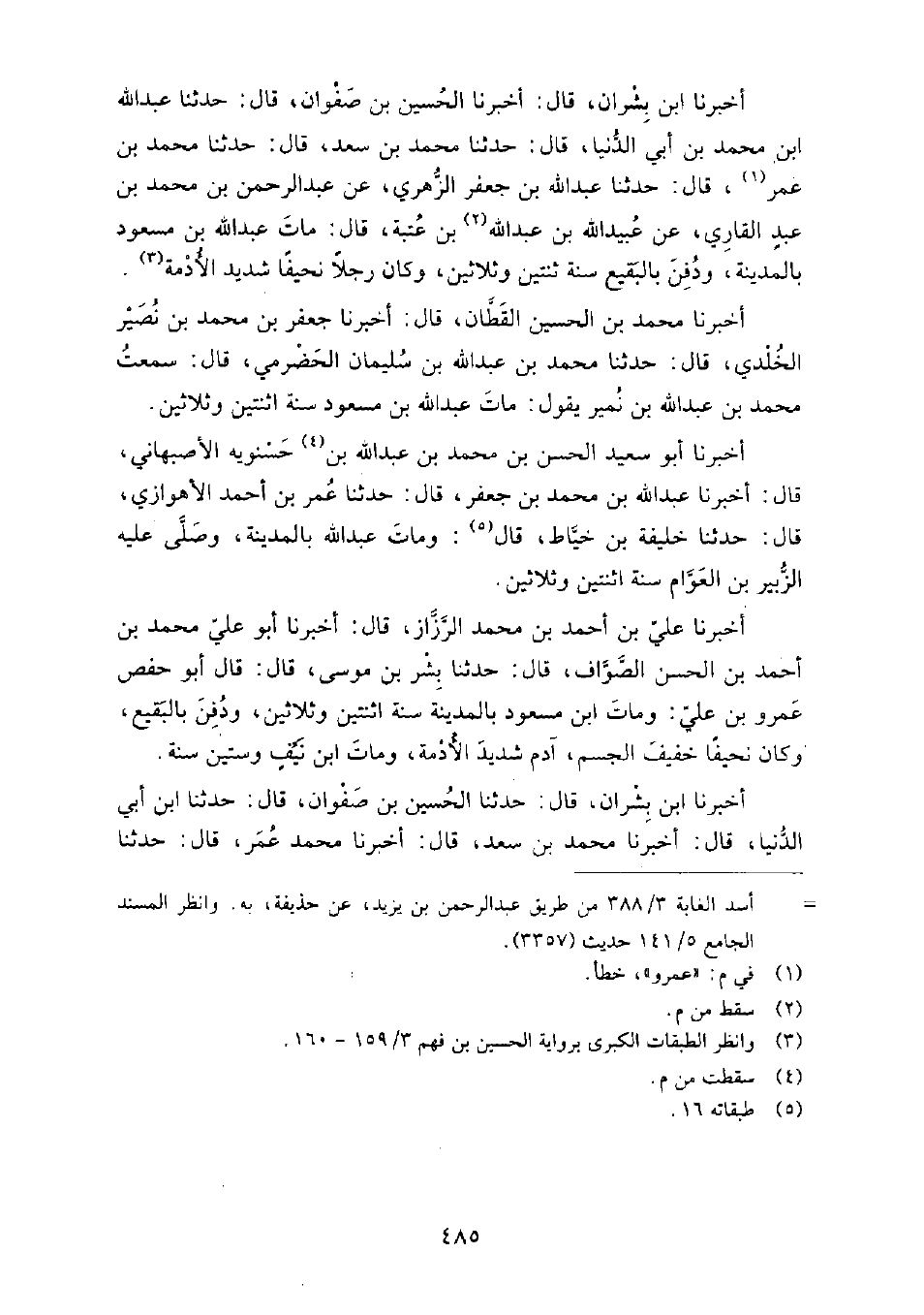 أَخْبَرَنَا ابْن بشران، قَالَ: أَخْبَرَنَا الْحُسَيْن بْن صفوان، قَالَ: حَدَّثَنَا عَبْدُ الله بْن مُحَمَّدِ بْن أَبِي الدنيا، قَالَ: حَدَّثَنَا مُحَمَّدُ بْنُ سعد، قَالَ: حَدَّثَنَا مُحَمَّدُ بْنُ عمر، قال: حَدَّثَنَا عَبْدُ الله بْن جَعْفَرٍ الزهري، عَنْ عَبْد الرَّحْمَنِ بْن مُحَمَّدِ بْن عَبْد القاري، عَنْ عبيد الله بن عبد الله بْن عتبة، قَالَ: مات عَبْد الله بْن مسعود بالمدينة، ودفن بالبقيع سنة اثنتين وثلاثين، وكان رجلا نحيفا شديد الأدمة.