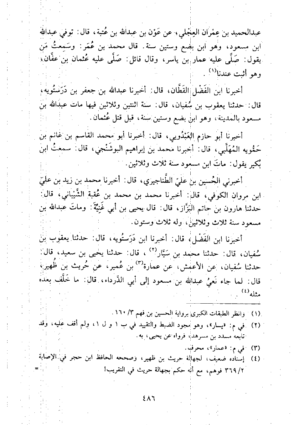 أَخْبَرَنَا ابْن الفضل، قَالَ: أَخبرنا ابْن درستويه، قَالَ: حَدَّثَنَا يعقوب بْن سفيان، قَالَ: حَدَّثَنَا مُحَمَّدُ بْنُ سيار، قَالَ: حَدَّثَنَا يَحْيَى بْن سعيد، قَالَ: حَدَّثَنَا سفيان، عَنِ الأعمش، عَنْ عمارة بْن عمير، عَنْ حريث بْن ظهير، قَالَ: لما جاء نعي عَبْد الله بن مسعود إِلَى أَبِي الدرداء، قَالَ: ما خلف بعده مثله.