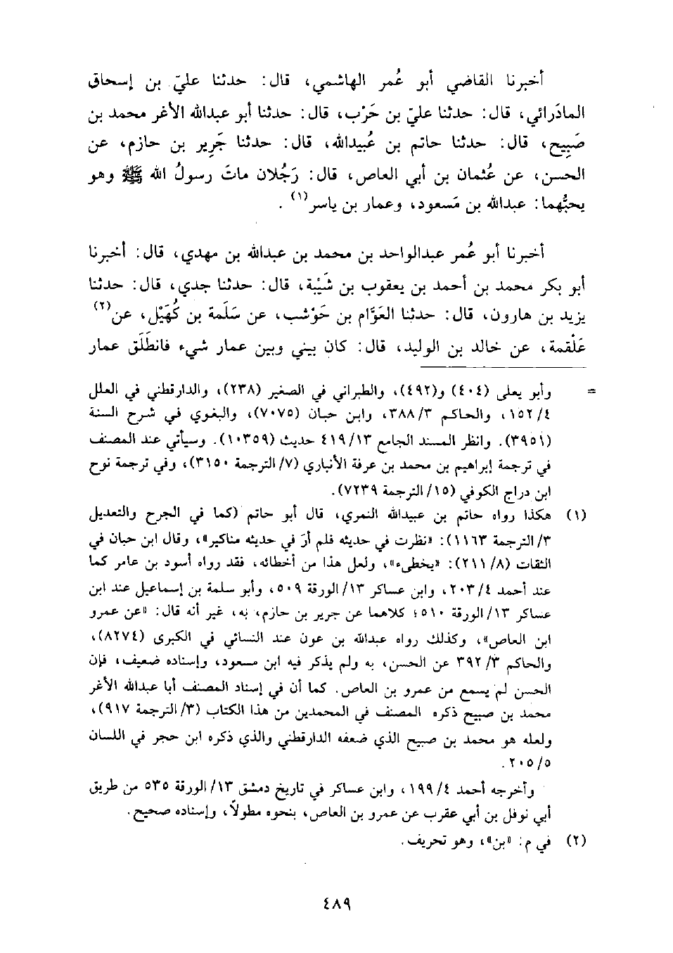 (90) أَخْبَرَنَا الْقَاضِي أَبُو عُمَرَ الْهَاشِمِيُّ، قَالَ: حَدَّثَنَا عَلِيُّ بْنُ إِسْحَاقَ الْمَادَرَائِيُّ، قَالَ: حَدَّثَنَا عَلِيُّ بْنُ حَرْبٍ، قَالَ: حَدَّثَنَا أَبُو عَبْدِ اللَّهِ الأَغَرُّ مُحَمَّدُ بْنُ صُبَيْحٍ، قَالَ: حَدَّثَنَا حَاتِمُ بْنُ عُبَيْدِ اللَّهِ، قَالَ: حَدَّثَنَا جَرِيرُ بْنُ حَازِمٍ، عَنِ الْحَسَنِ، عَنْ عُثْمَانَ بْنِ أَبِي الْعَاصِ، قَالَ: رَجُلانِ مَاتَ رَسُولُ اللَّهِ صَلَّى اللَّهُ عَلَيْهِ وَسَلَّمَ وَهُوَ يُحِبُّهُمَا: عَبْدُ اللَّهِ بْنُ مَسْعُودٍ، وَعَمَّارُ بْنُ يَاسِرٍ