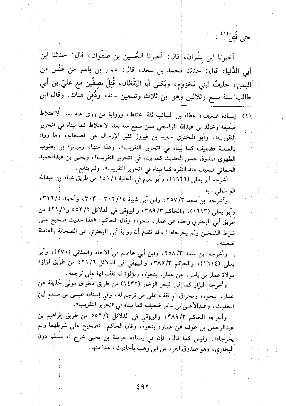 أَخْبَرَنَا ابْن بشران، قَالَ: أَخْبَرَنَا الْحُسَيْن بْن صفوان، قَالَ: حَدَّثَنَا ابْن أَبِي الدنيا، قَالَ: حَدَّثَنَا مُحَمَّدُ بْنُ سعد، قَالَ: عمار بْن ياسر من عنس من اليمن، حليف لبني مخزوم، يكنى أبا اليقظان، قتل بصفين مع عَلِيّ بْن أَبِي طالب سنة سبع وثلاثين، وهو ابْن ثلاث وتسعين سنة، ودفن هناك.