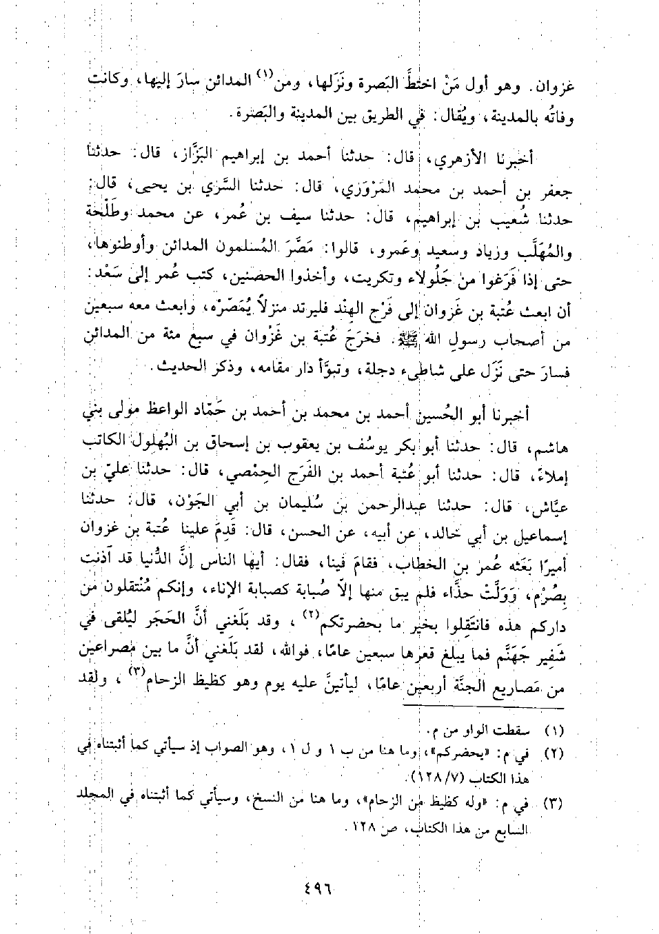 (94) أَخْبَرَنَا الأَزْهَرِيُّ، قَالَ: حَدَّثَنَا أَحْمَدُ بْنُ إِبْرَاهِيمَ الْبَزَّارُ، قَالَ: حَدَّثَنَا جَعْفَرُ بْنُ أَحْمَدَ بْنِ مُحَمَّدٍ الْمَرْوَزِيُّ، قَالَ: حَدَّثَنَا السَّرِيُّ بْنُ يَحْيَى، قَالَ: حَدَّثَنَا شُعَيْبُ بْنُ إِبْرَاهِيمَ، قَالَ: حَدَّثَنَا سَيْفُ بْنُ عُمَرَ، عَنْ مُحَمَّدٍ وَطَلْحَةَ وَالْمُهَلَّبِ وَزِيَادٍ وَسَعِيدٍ وَعَمْرٍو، قَالُوا: مَصَّرَ الْمُسْلِمُونَ الْمَدَائِنَ وَأَوْطَنُوهَا، حَتَّى إِذَا فَرَغُوا مِنْ جَلُولا وَتَكْرِيتَ، وَأَخَذُوا الْحِصْنَيْنِ، كَتَبَ عُمَرُ إِلَى سَعْدٍ، أَنِ ابْعَثْ عُتْبَةَ بْنَ غَزْوَانَ إِلَى فَرَجِ الْهِنْدِ فَلْيَرْتَدَّ مَنْزِلا يُمَصِّرُهُ، وَابْعَثْ مَعَهُ سَبْعِينَ مِنْ أَصْحَابِ رَسُولِ اللَّهِ صَلَّى اللَّهُ عَلَيْهِ وَسَلَّمَ فَخَرَجَ عُتْبَةُ بْنُ غَزْوَانَ فِي سَبْعِ مِائَةٍ مِنَ الْمَدَائِنِ فَسَارَ حَتَّى نَزَلَ عَلَى شَاطِئِ دِجْلَةَ، وَتَبَوَّأَ دَارَ مُقَامِهِ، وَذَكَرَ الْحَدِيثَ