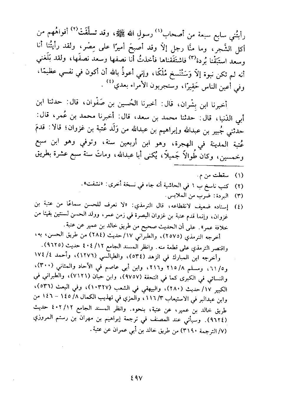 أَخْبَرَنَا ابْن بشران، قَالَ: أَخبرنا الْحُسَيْن بْن صفوان، قَالَ: حَدَّثَنَا ابْن أَبِي الدنيا، قَالَ: حَدَّثَنَا مُحَمَّدُ بْنُ سعد، قَالَ: أَخبرنا مُحَمَّدُ بْنُ عُمَر، حَدَّثَنِي جبير بْن عَبْدِ اللَّهِ، وإبراهيم بْن عَبْدِ اللَّهِ من ولد عتبة بْن غزوان، قالا: قدم عتبة المدينة في الهجرة، وهو ابْن أربعين سنة، وتوفي وهو ابْن سبع وخمسين، وكان طوالا جميلا، يكنى أبا عَبْد الله، ومات سنة سبع عشرة بطريق