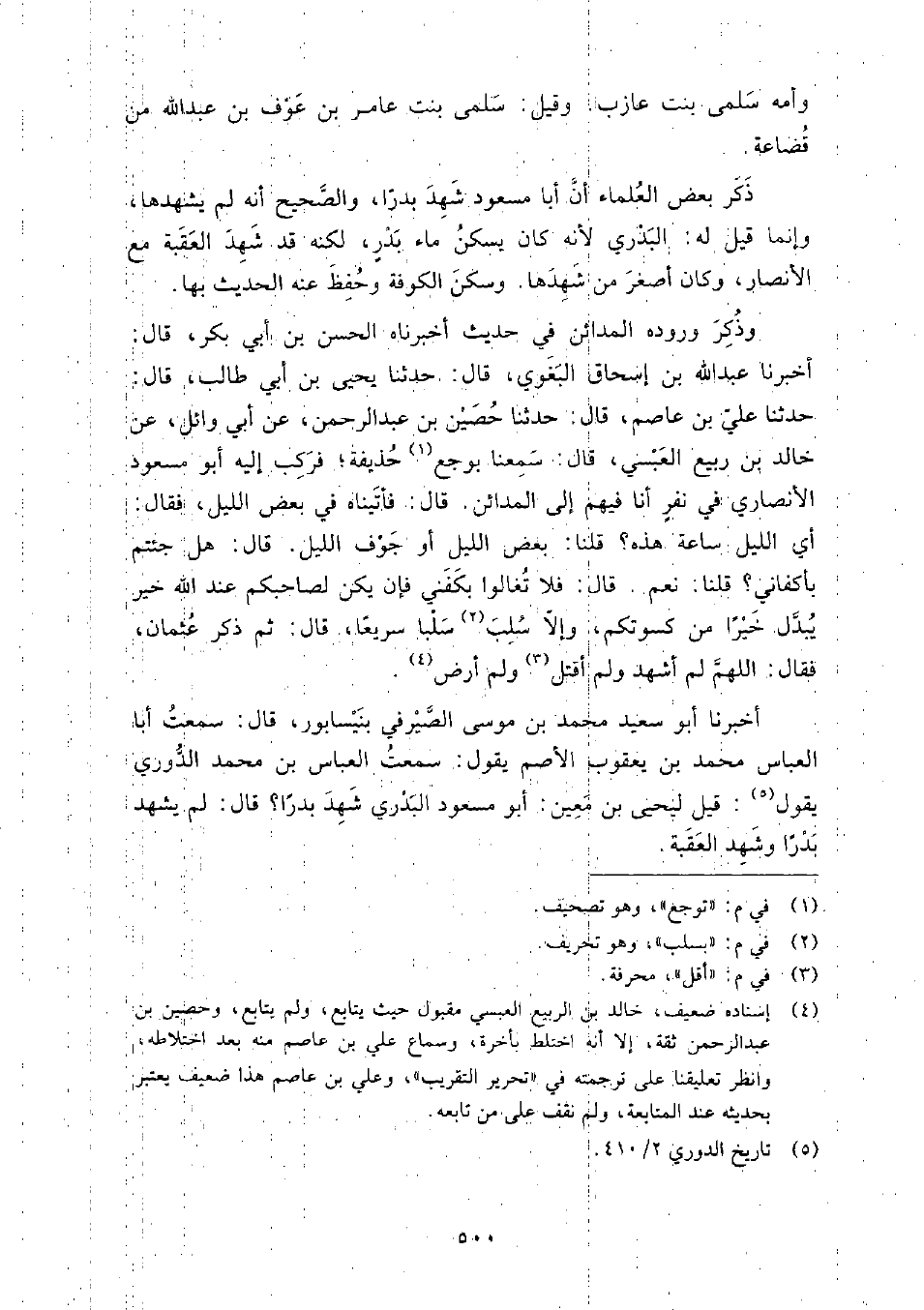 أَخْبَرَنَا أَبُو سعيد مُحَمَّد بْن مُوسَى الصيرفي، بنيسابور، قَالَ: سمعت أبا العباس مُحَمَّد بْن يعقوب الأصم، يقول: سمعت العباس بْن مُحَمَّد الدوري، يقول: قيل ليحيى بْن معين: أَبُو مسعود البدري شهد بدرا؟ قَالَ: لم يشهد بدرا وشهد العقبة.
