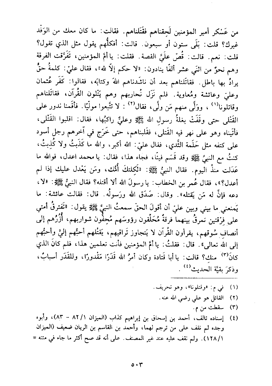 فَقَاتَلْنَاهُمْ بَعْدَ أَنْ نَاشَدْنَاهُمُ اللَّهَ وَكِتَابَهُ، فَقَالُوا: كَفَرَ عُثْمَانُ، وَعَلِيٌّ، وَعَائِشَةُ، وَمُعَاوِيَةُ.