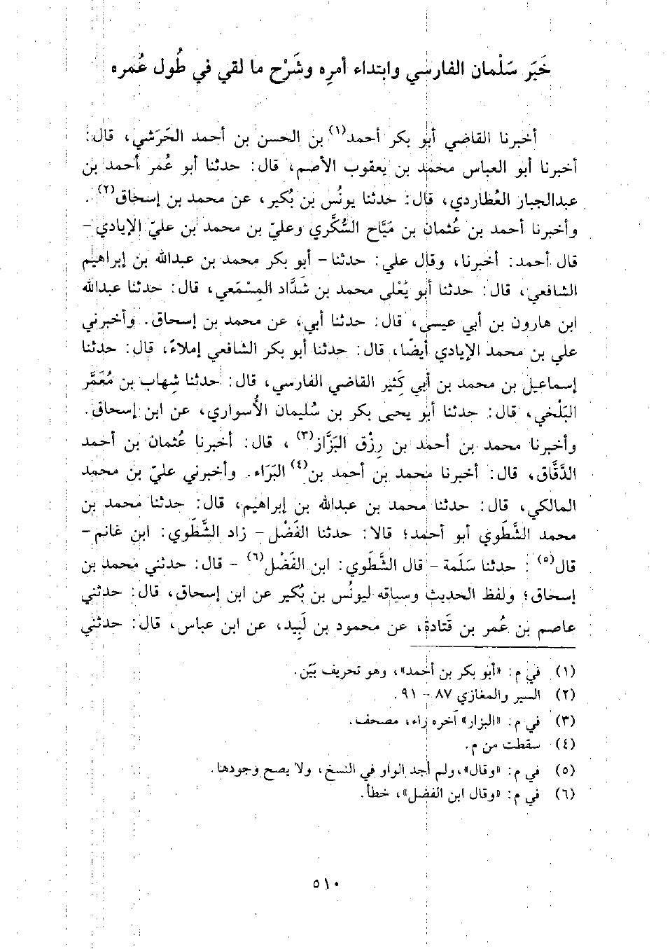 وَأَخْبَرَنَا أَحْمَدُ بْنُ عثمانَ بْنِ مَيَّاحٍ السُّكَّرِيُّ وَعَلِيُّ بْنُ مُحَمَّدِ بْنِ عَلِيٍّ الإِيَادِيُّ، قَالَ أَحْمَدُ: أَخْبَرَنَا، وَقَالَ عَلِيٌّ: حَدَّثَنَا أَبُو بَكْرٍ مُحَمَّدُ بْنُ عَبْدِ اللَّهِ بْنِ إِبْرَاهِيمَ الشَّافِعِيُّ، قَالَ: حَدَّثَنَا أَبُو يَعْلَى مُحَمَّدُ بْنُ شَدَّادٍ الْمِسْمَعِيُّ، قَالَ: حَدَّثَنَا عَبْدُ اللَّهِ بْنُ هَارُونَ بْنِ أَبِي عِيسَى، قَالَ: حَدَّثَنَا أَبِي عَنْ مُحَمَّدِ بْنِ إِسْحَاقَ، وَأَخْبَرَنِي عَلِيُّ بْنُ مُحَمَّدٍ الإِيَادِيُّ أَيْضًا، قَالَ: حَدَّثَنَا أَبُو بَكْرٍ الشَّافِعِيُّ إِمْلاءً، قَالَ: حَدَّثَنَا إِسْمَاعِيلُ بْنُ مُحَمَّدِ بْنِ أَبِي كَثِيرٍ الْقَاضِي الْفَارِسِيُّ، قَالَ: حَدَّثَنَا شِهَابُ بْنُ مَعْمَرٍ الْبَلْخِيُّ، قَالَ: حَدَّثَنَا أَبُو يَحْيَى بَكْرُ بْنُ سُلَيْمَانَ الأُسْوَارِيُّ، عَنِ ابْنِ إِسْحَاقَ، وَأَخْبَرَنَا مُحَمَّدُ بْنُ أَحْمَدَ بْنِ رِزْقٍ الْبَزَّارُ، قَالَ: أَخبرنا عُثْمَانُ بْنُ أَحْمَدَ الدَّقَّاقُ، قَالَ: أَخبرنا مُحَمَّدُ بْنُ أَحْمَدَ الْبَرَاءُ، وَأَخْبَرَنِي عَلِيُّ بْنُ مُحَمَّدٍ الْمَالِكِيُّ، قَالَ: حَدَّثَنَا مُحَمَّدُ بْنُ عَبْدِ اللَّهِ بْنِ إِبْرَاهِيمَ، قَالَ: حَدَّثَنَا مُحَمَّدُ بْنُ مُحَمَّدٍ الشَّطَوِيُّ أَبُو أَحْمَدَ، قَالا: حَدَّثَنَا الْفَضْلُ زَادَ الشَّطَوِيُّ: ابْنُ غَانِمٍ، قَالَ: حَدَّثَنَا سَلَمَةُ قال الشَّطَوِيُّ: ابْنُ الْفَضْلِ قال: حَدَّثَنِي مُحَمَّدُ بْنُ إِسْحَاقَ، وَلَفْظُ الْحَدِيثِ وَسِيَاقُهُ لِيُونُسَ بْنِ بُكَيْرٍ عَنِ ابْنِ إِسْحَاقَ، قَالَ: حَدَّثَنِي عَاصِمُ بْنُ عُمَرَ بْنِ قَتَادَةَ، عَنْ مَحْمُودِ بْنِ لَبِيدٍ، عَنِ ابْنِ عَبَّاسٍ، قَالَ: حَدَّثَنِي