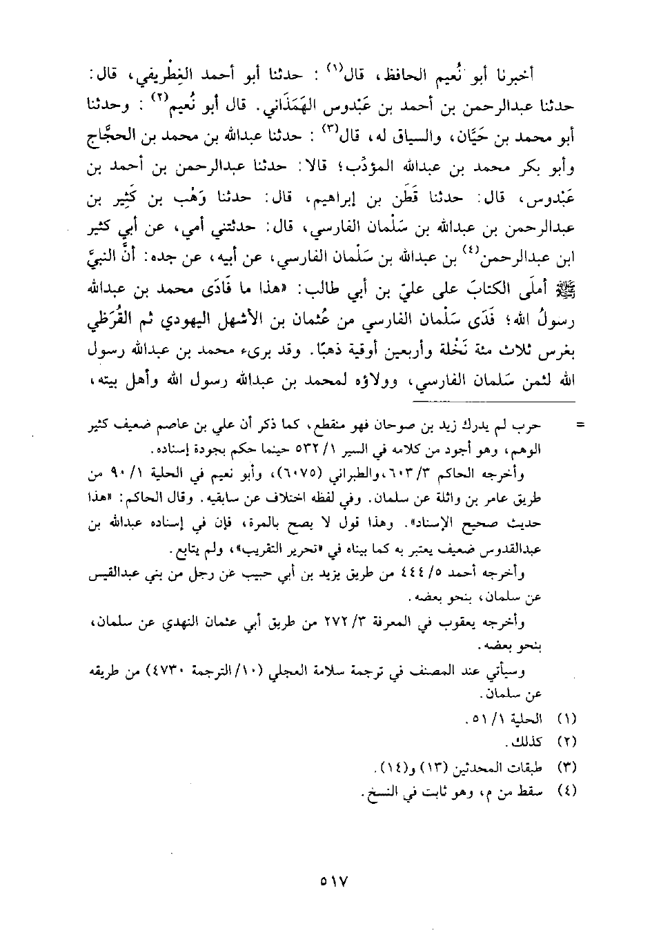 (103) -[1: 517] أَخْبَرَنَا أَبُو نُعَيْمٍ الْحَافِظُ، قَالَ: حَدَّثَنَا أَبُو أَحْمَدَ الْغِطْرِيفِيُّ، قَالَ: حَدَّثَنَا عَبْدُ الرَّحْمَنِ بْنُ أَحْمَدَ بْنِ عَبْدُوسٍ الْهَمَذَانِيُّ، قَالَ أَبُو نُعَيْمٍ: وَحَدَّثَنَا أَبُو مُحَمَّدِ بْنُ حَيَّانَ، وَالسِّيَاقُ لَهُ، قَالَ: حَدَّثَنَا عَبْدُ اللَّهِ بْنُ مُحَمَّدِ بْنِ الْحَجَّاجِ وَأَبُو بَكْرٍ مُحَمَّدُ بْنُ عَبْدِ اللَّهِ الْمُؤَدِّبُ، قَالا: حَدَّثَنَا عَبْدُ الرَّحْمَنِ بْنُ أَحْمَدَ بْنِ عَبْدُوسٍ، قَالَ: حَدَّثَنَا قَطَنُ بْنُ إِبْرَاهِيمَ، قَالَ: حَدَّثَنَا وَهْبُ بْنُ كَثِيرِ بْنِ عَبْدِ الرَّحْمَنِ بْنِ عَبْدِ اللَّهِ بْنِ سَلْمَانَ الْفَارِسِيُّ، قَالَ: حَدَّثَتْنِي أُمِّي، عَنْ أَبِي كَثِيرِ بْنِ عَبْدِ الرَّحْمَنِ بْنِ عَبْدِ اللَّهِ بْنِ سَلْمَانَ الْفَارِسِيِّ، عَنْ أَبِيهِ، عَنْ جَدِّهِ، أَنَّ النَّبِيَّ صَلَّى اللَّهُ عَلَيْهِ وَسَلَّمَ أَمْلَى الْكُتَّابَ عَلَى عَلِيِّ بْنِ أَبِي طَالِبٍ: " هَذَا مَا فَادَى مُحَمَّدُ بْنُ عَبْدِ اللَّهِ رَسُولُ اللَّهِ، فَدَى سَلْمَانَ الْفَارِسِيَّ مِنْ عُثْمَانَ بْنِ الأَشْهَلِ الْيَهُودِيِّ ثُمَّ الْقُرَظِيِّ بِغَرْسِ ثَلاثِ مِائَةِ نَخْلَةٍ وَأَرْبَعِينَ أُوقِيَّةً ذَهَبًا.