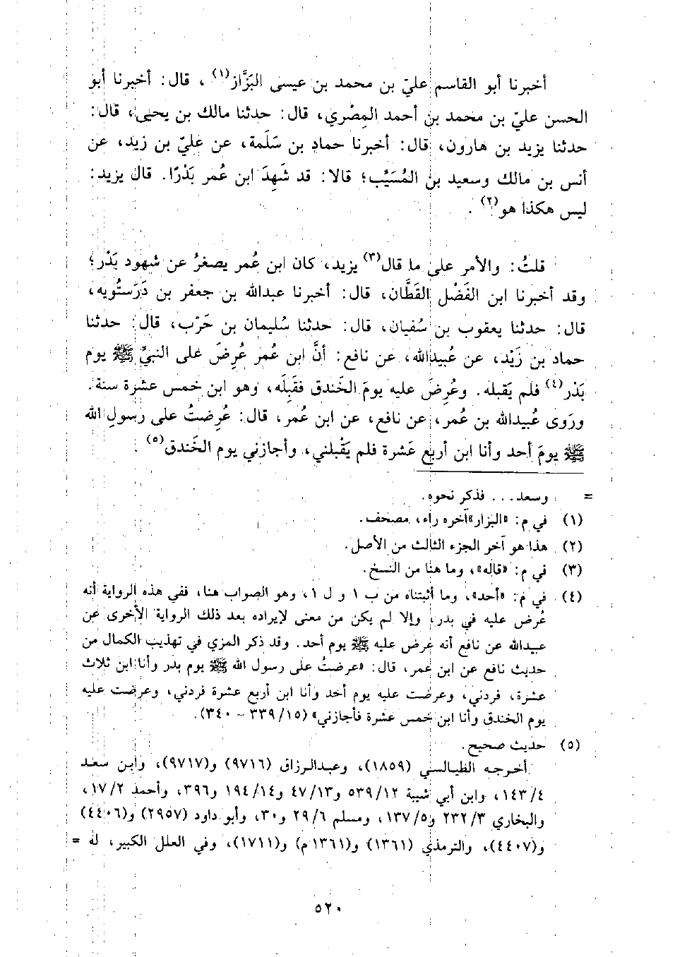 (105) وَقَدْ أَخْبَرَنَا ابْنُ الْفَضْلِ الْقَطَّانُ، قَالَ: أَخْبَرَنَا عَبْدُ اللَّهِ بْنُ جَعْفَرِ بْنِ دُرُسْتُوَيْهِ، قَالَ: حَدَّثَنَا يَعْقُوبُ بْنُ سُفْيَانَ، قَالَ: حَدَّثَنَا سَلْمَانُ بْنُ حَرْبٍ، قَالَ: حَدَّثَنَا حَمَّادُ بْنُ زَيْدٍ، عَنْ عُبَيْدِ اللَّهِ، عَنْ نَافِعٍ، أَنَّ ابْنَ عُمَرَ عُرِضَ عَلَى النَّبِيِّ صَلَّى اللَّهُ عَلَيْهِ وَسَلَّمَ يَوْمَ بَدْرٍ فَلَمْ يَقْبَلْهُ، وَعُرِضَ عَلَيْهِ يَوْمَ الْخَنْدَقِ فَقَبِلَهُ، وَهُوَ ابْنُ خَمْسَ عَشْرَةَ سَنَةً