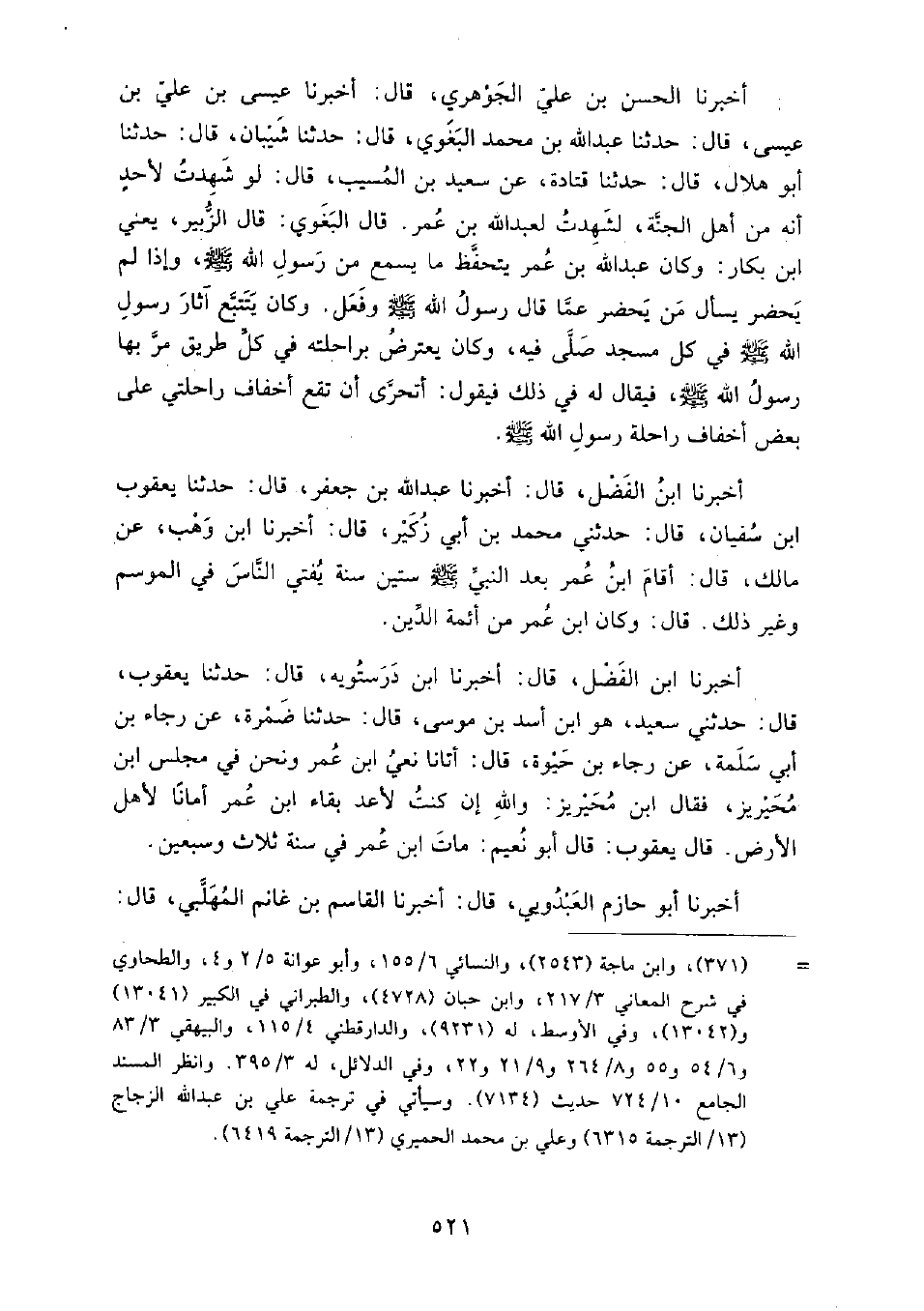 وكان يتتبع آثار رسول الله صَلَّى اللَّهُ عَلَيْهِ وَسَلَّمَ في كل مسجد صلى فيه، وكان يعترض براحلته في كل طريق مر بها رسول الله صَلَّى اللَّهُ عَلَيْهِ وَسَلَّمَ فيقال له في ذلك، فيقول: أتحرى أن تقع أخفاف راحلتي على بعض أخفاف راحلة رسول الله صَلَّى اللَّهُ عَلَيْهِ وَسَلَّمَ أَخْبَرَنَا ابْن الفضل، قَالَ: أَخْبَرَنَا عَبْدُ الله بْنُ جَعْفَرٍ، قَالَ: حَدَّثَنَا يعقوب بْن سفيان، قَالَ: حَدَّثَنِي مُحَمَّد بْن أَبِي زكير، قَالَ: أَخْبَرَنَا ابْن وهب، عَنْ مالك، قَالَ: أقام ابْن عُمَر بعد النبي صَلَّى اللَّهُ عَلَيْهِ وَسَلَّمَ ستين سنة يفتي الناس في الموسم وغير ذلك، قَالَ: وكان ابْن عُمَر من أئمة الدين.