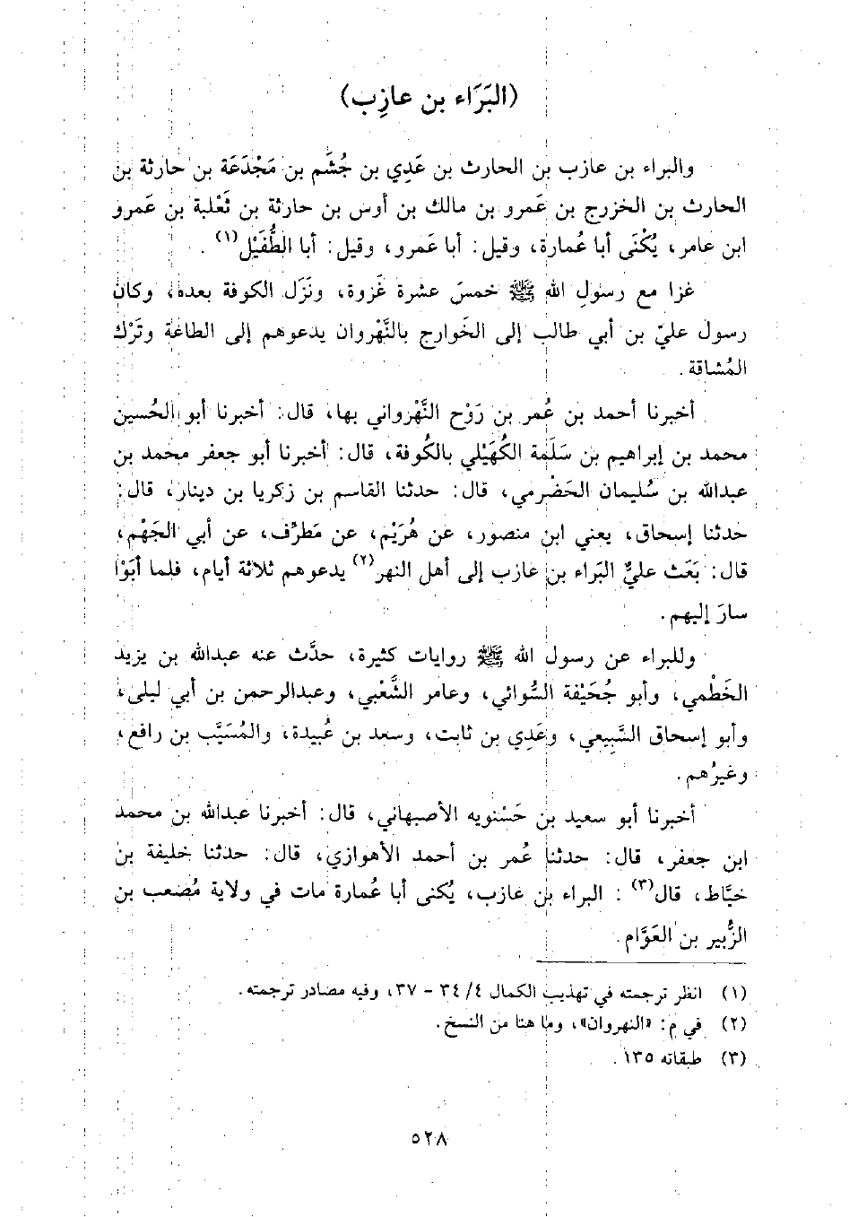 أَخْبَرَنَا أَبُو سعيد بْن حسنويه الأصبهاني، قَالَ: أَخبرنا عَبْدُ اللَّهِ بْن مُحَمَّدِ بْن جَعْفَرٍ، قَالَ: حَدَّثَنَا عُمَر بْن أَحْمَد الأهوازي، قَالَ: حَدَّثَنَا خليفة بْن خياط، قَالَ البراء بْن عازب يكنى أبا عمارة: مات في ولاية مصعب بْن الزبير بْن العوام.
