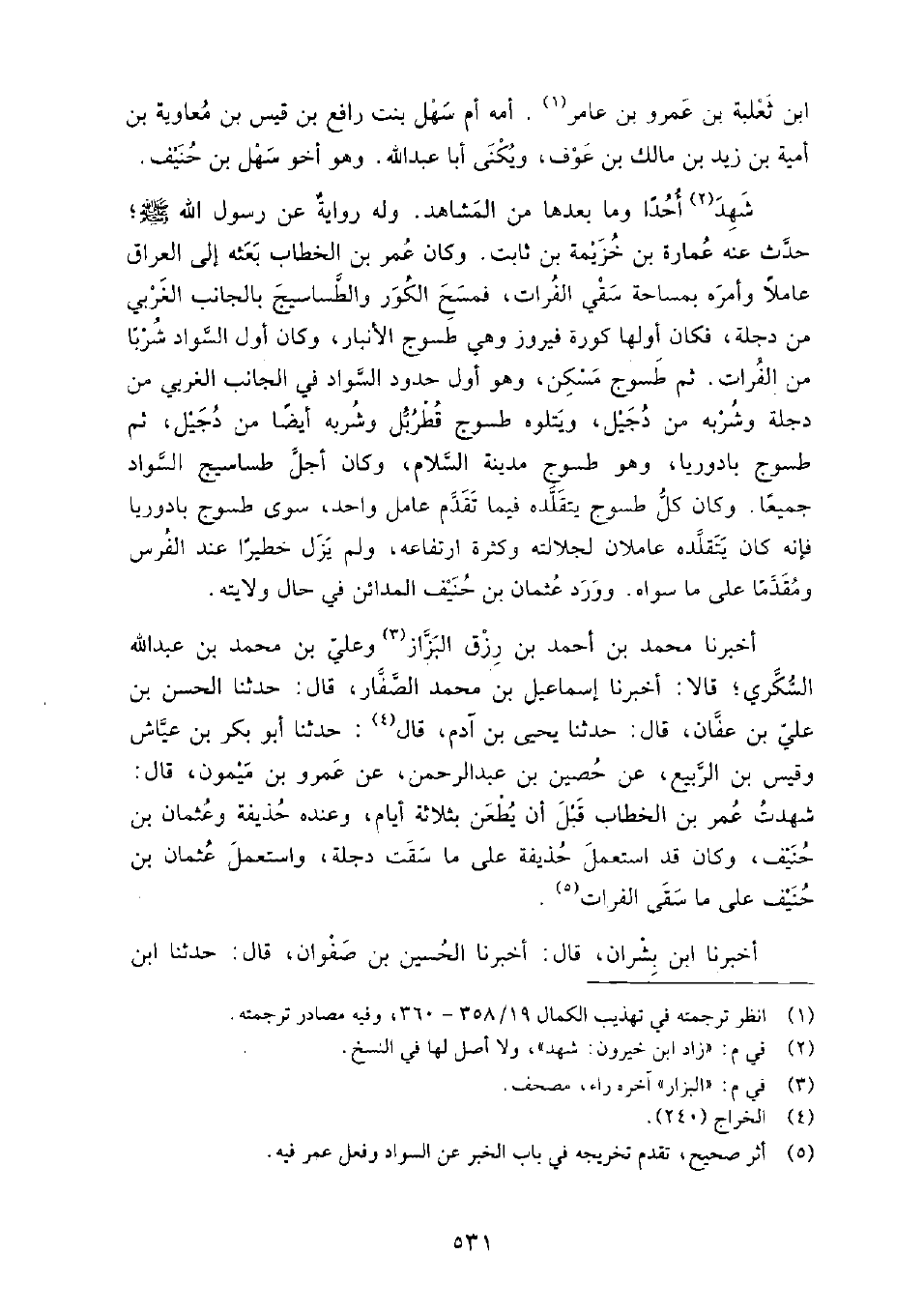أَخْبَرَنا مُحَمَّدُ بْنُ أَحْمَد بْن رزق البزاز، وعلي بْن مُحَمَّدِ بْن عَبْدِ اللَّهِ السكري، قالا: أَخبرنا إسماعيل بْن مُحَمَّد الصفار، قَالَ: حَدَّثَنَا الْحَسَن بْن عَلِيّ بْن عفان، قَالَ: حَدَّثَنَا يَحْيَى بْن آدم، قَالَ: حَدَّثَنَا أَبُو بَكْرِ بْن عياش، وقيس بْن الربيع، عَنْ حصين بْن عَبْد الرَّحْمَنِ، عَنْ عمرو بْن ميمون، قَالَ: شهدت عُمَر بْن الخطاب قبل أن يطعن بثلاثة أيام، وعنده حذيفة، وعثمان بْن حنيف، وكان قد استعمل حذيفة على ما سقت دجلة، واستعمل عثمان بْن حنيف على ما سقى الفرات.