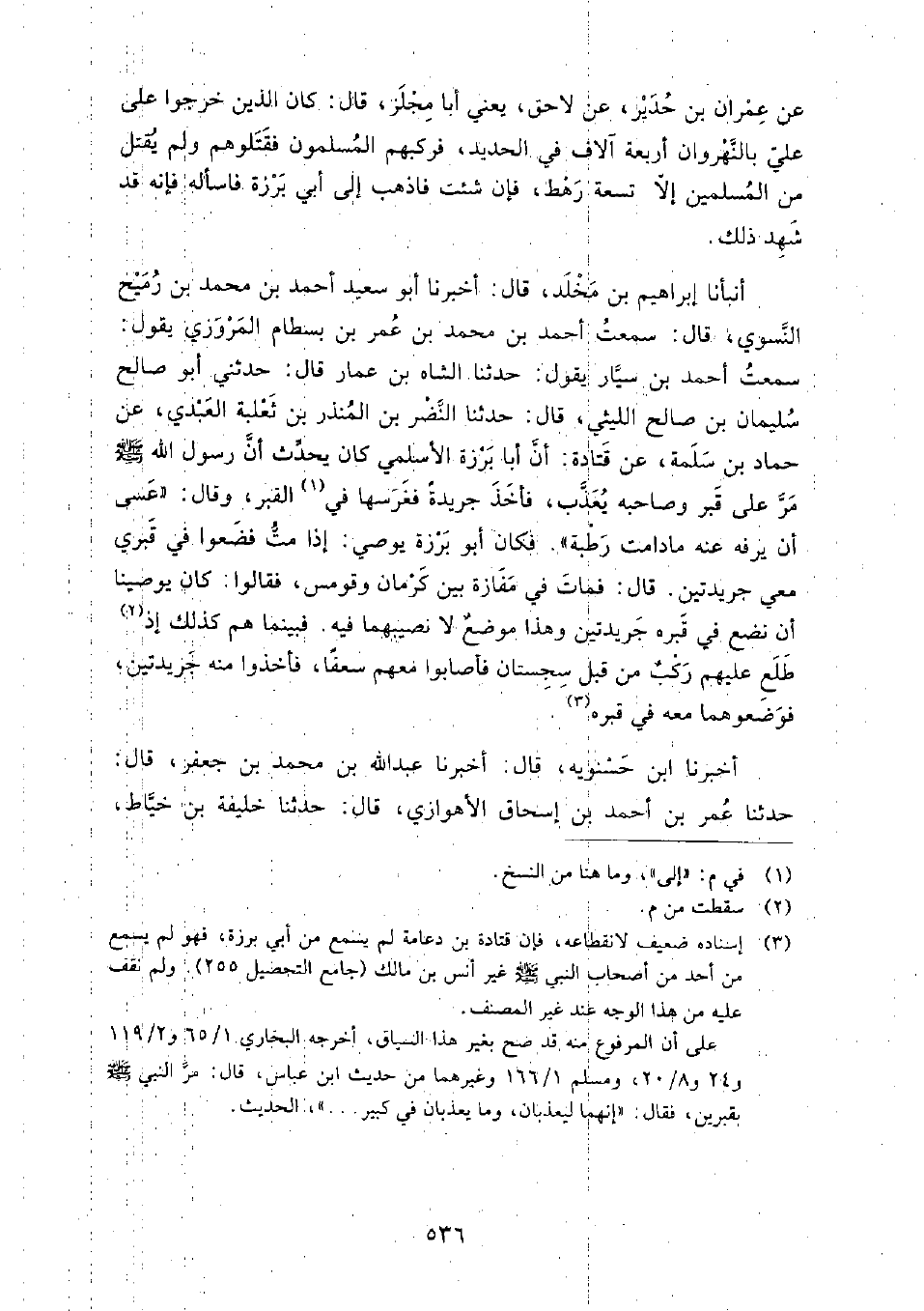 (113) -[1: 536] أَنْبَأَنَا إِبْرَاهِيمُ بْنُ مَخْلَدٍ، قَالَ: أَخْبَرَنَا أَبُو سَعِيدٍ أَحْمَدُ بْنُ مُحَمَّدِ بْنِ رُمَيْحٍ النَّسَوِيُّ، قَالَ: سَمِعْتُ أَحْمَدَ بْنَ مُحَمَّدِ بْنِ عُمَرَ بْنِ بِسْطَامَ الْمَرْوَزِيَّ، يقول: سمعت أَحْمَدَ بْنَ سَيَّارٍ، يَقُولُ: حَدَّثَنَا الشَّاهُ بْنُ عَمَّارٍ، قَالَ: حَدَّثَنِي أَبُو صَالِحٍ سُلَيْمَانُ بْنُ صَالِحٍ اللَّيْثِيُّ، قَالَ: حَدَّثَنَا النَّضْرُ بْنُ الْمُنْذِرِ بْنِ ثَعْلَبَةَ الْعَبْدِيُّ، عَنْ حَمَّادِ بْنِ سَلَمَةَ، عَنْ قَتَادَةَ، أَنَّ أَبَا بَرْزَةَ الأَسْلَمِيَّ، كَانَ يُحَدِّثُ أَنَّ رَسُولَ اللَّهِ صَلَّى اللَّهُ عَلَيْهِ وَسَلَّمَ مَرَّ عَلَى قَبْرٍ وَصَاحِبُهُ يُعَذَّبُ، فَأَخَذَ جَرِيدَةً فَغَرَسَهَا فِي الْقَبْرِ، وَقَالَ: " عَسَى أَنْ يَرْفَهَ عَنْهُ مَا دَامَتْ رَطْبَةً ".