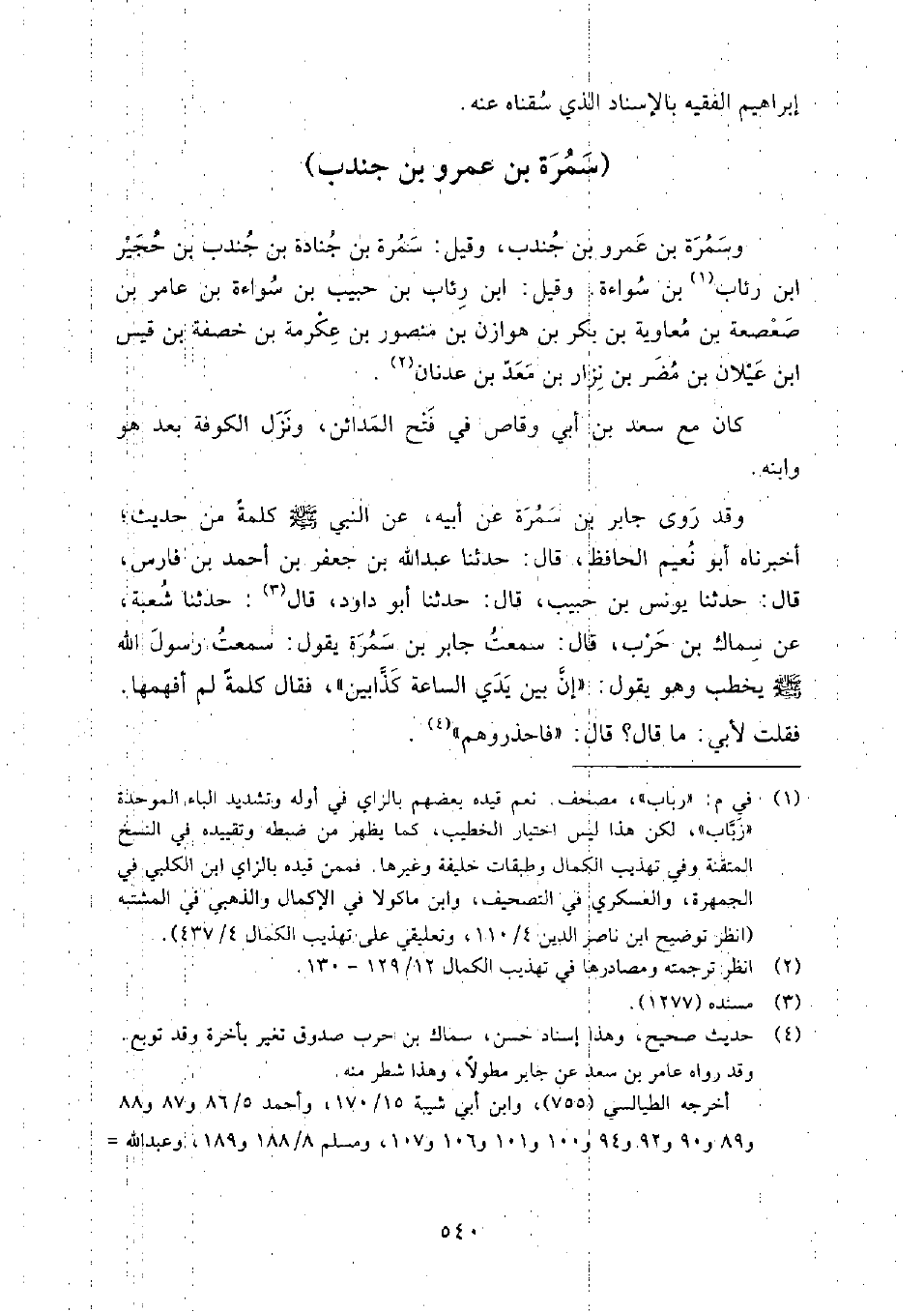 (115) -[1: 540] وَقَدْ رَوَى جَابِرُ بْنُ سَمُرَةَ، عَنْ أَبِيهِ، عَنِ النَّبِيِّ صَلَّى اللَّهُ عَلَيْهِ وَسَلَّمَ كَلِمَةً مِنْ حَدِيثٍ، أَخْبَرَنَاهُ أَبُو نُعَيْمٍ الْحَافِظُ، قَالَ: حَدَّثَنَا عَبْدُ اللَّهِ بْنُ جَعْفَرِ بْنِ أَحْمَدَ بْنِ فَارِسٍ، قَالَ: حَدَّثَنَا: يُونُسُ بْنُ حَبِيبٍ، قَالَ: حَدَّثَنَا: أَبُو دَاوُدَ، قَالَ: حَدَّثَنَا شُعْبَةُ، عَنْ سِمَاكِ بْنِ حَرْبٍ، قَالَ: سَمِعْتُ جَابِرَ بْنَ سَمُرَةَ، يَقُولُ: سَمِعْتُ رَسُولَ اللَّهِ صَلَّى اللَّهُ عَلَيْهِ وَسَلَّمَ يَخْطُبُ وَهُوَ يَقُولُ: " إِنَّ بَيْنَ يَدَيِ السَّاعَةِ كَذَّابِينَ "، فَقَالَ كَلِمَةٌ لَمْ أَفْهَمْهَا، فَقُلْتُ لأَبِي: مَا قَالَ؟ قَالَ: " فَاحْذَرُوهُمْ "