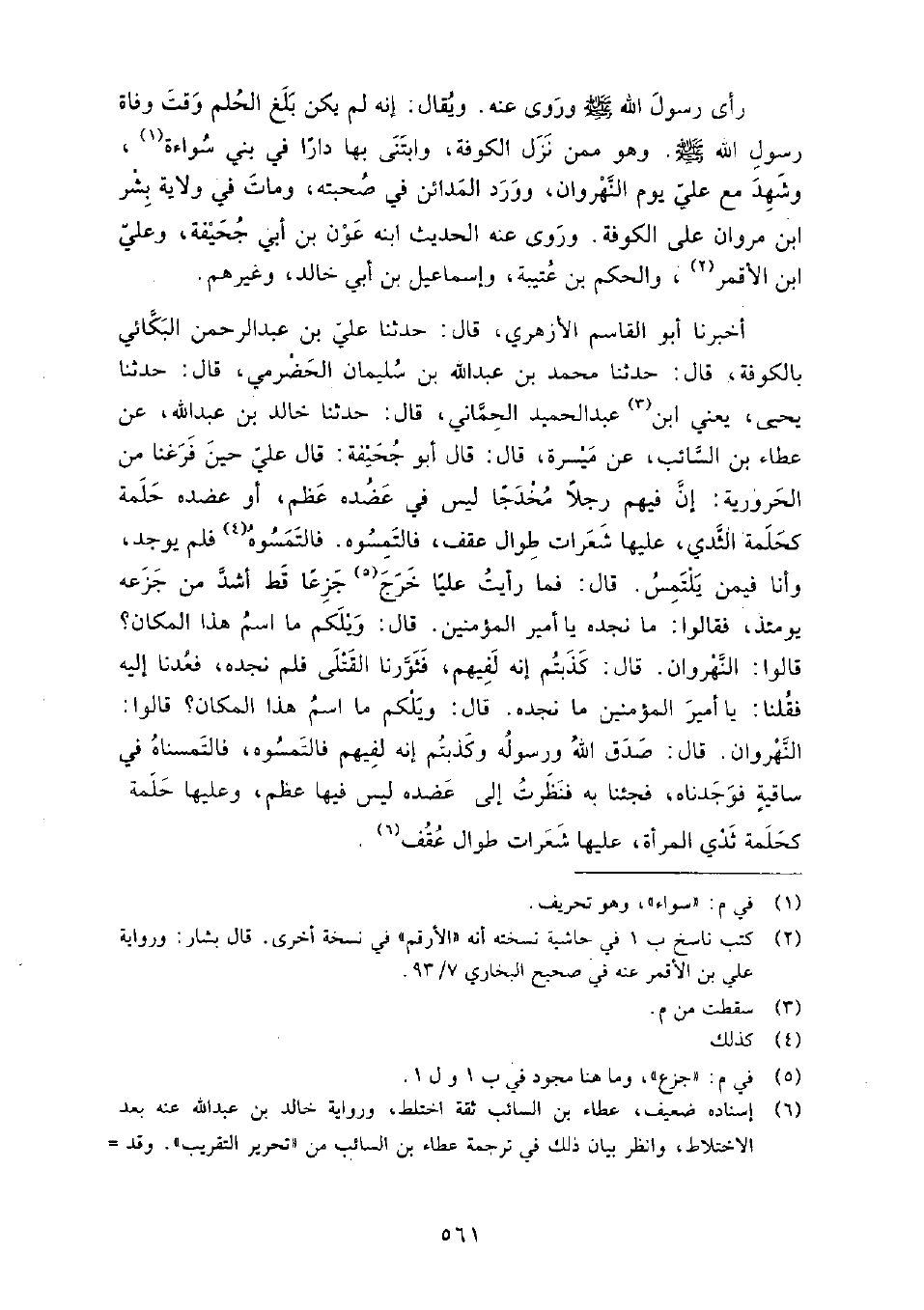 (123) أَخْبَرَنَا أَبُو الْقَاسِمِ الأَزْهَرِيُّ، قَالَ: حَدَّثَنَا عَلِيُّ بْنُ عَبْدِ الرَّحْمَنِ الْبَكَّائِيُّ، بِالْكُوفَةِ، قَالَ: حَدَّثَنَا مُحَمَّدُ بْنُ عَبْدِ اللَّهِ بْنِ سُلَيْمَانَ الْحَضْرَمِيُّ، قَالَ: حَدَّثَنَا يَحْيَى يَعْنِي: عَبْدَ الْحَمِيدِ الْحِمَّانِيَّ، قَالَ: حَدَّثَنَا خَالِدُ بْنُ عَبْدِ اللَّهِ، عَنْ عَطَاءِ بْنِ السَّائِبِ، عَنْ مَيْسَرَةَ، قَالَ: قَالَ أَبُو جُحَيْفَةَ: قَالَ عَلِيٌّ: حِينَ فَرَغْنَا مِنَ الْحَرُورِيَّةِ، إِنَّ فِيهِمْ رَجُلا مُخْدَجًا لَيْسَ فِي عَضُدِهِ عَظْمٌ، أَوْ عَضُدُهُ حَلَمَةٌ كَحَلَمَةِ الثَّدْيِ، عَلَيْهَا شَعْرَاتٌ طِوَالٌ عَقْفٌ، فَالْتَمِسُوهُ، فَالْتَمِسُوهُ، فَلَمْ يُوجَدْ، وَأَنَا فِيمَنْ يَلْتَمِسُ.
