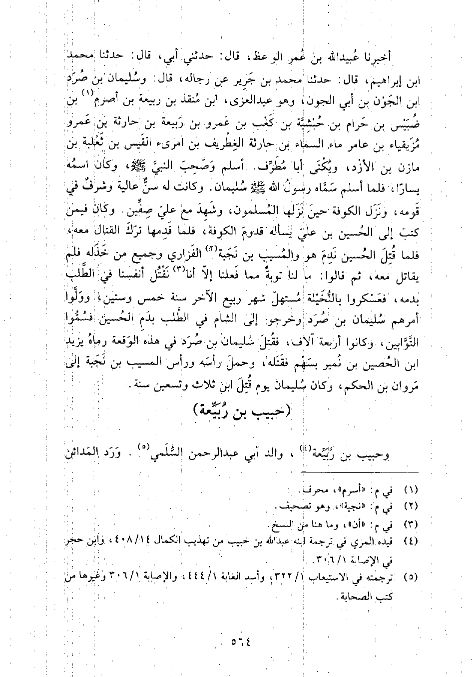 وكان فيمن كتب إِلَى الْحُسَيْن بْن عَلِيّ يسأله قدوم الكوفة، فلما قدمها ترك القتال معه، فلما قتل الْحُسَيْن ندم هو والمسيب بْن نجية الفزاري وجميع من خذله فلم يقاتل معه، ثم قالوا: ما لنا توبة مما فعلنا إلا أنا نقتل أنفسنا في الطلب بدمه، فعسكروا بالنخيلة مستهل شهر ربيع الآخر سنة خمس وستين، وولوا أمرهم سُلَيْمَان بْن صرد وخرجوا إِلَى الشام في الطلب بدم الْحُسَيْن فسموا التوابين، وكانوا أربعة آلاف، فقتل سُلَيْمَان بْن صرد في هذه الوقعة رماه يزيد بْن الحصين بْن نمير بسهم فقتله، وحمل رأسه ورأس المسيب بْن نجية إِلَى مروان بْن الحكم، وكان سُلَيْمَان يوم قتل ابْن ثلاث وتسعين سنة.