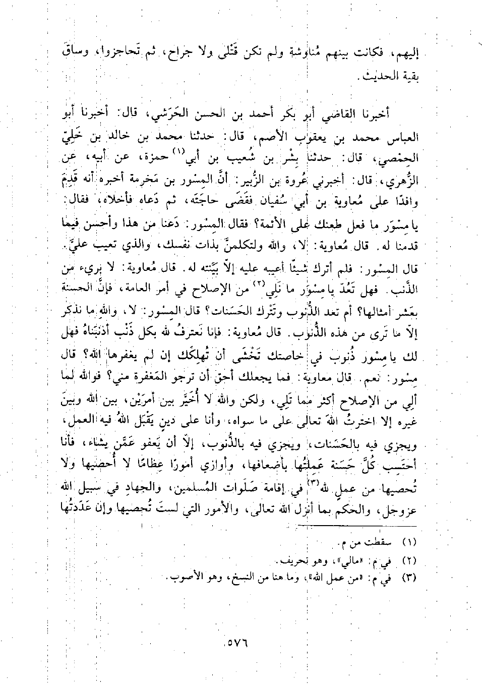 (133) أَخْبَرَنَا الْقَاضِي أَبُو بَكْرٍ أَحْمَدُ بْنُ الْحَسَنِ الْحَرَشِيُّ، قَالَ: أَخْبَرَنَا أَبُو الْعَبَّاسِ مُحَمَّدُ بْنُ يَعْقُوبَ الأَصَمُّ، قَالَ: حَدَّثَنَا مُحَمَّدُ بْنُ خَالِدِ بْنِ خَلِيٍّ الْحِمْصِيُّ، قَالَ: حَدَّثَنَا بِشْرُ بْنُ شُعَيْبِ بْنِ أبي حَمْزَةَ، عَنْ أَبِيهِ، عَنِ الزُّهْرِيِّ، قَالَ: أَخْبَرَنِي عُرْوَةُ بْنُ الزُّبَيْرِ، أَنَّ الْمِسْوَرَ بْنَ مَخْرَمَةَ أَخْبَرَهُ أَنَّهُ قَدِمَ وَافِدًا عَلَى مُعَاوِيَةَ بْنِ أَبِي سُفْيَانَ فَقَضَى حَاجَتَهُ، ثُمَّ دَعَاهُ فَأَخْلاهُ، فَقَالَ: يَا مِسْوَرُ، مَا فَعَلَ طَعْنُكَ عَلَى الأَئِمَّةِ؟ فَقَالَ الْمِسْوَرُ: دَعْنَا مِنْ هَذَا وَأَحْسِنْ فِيمَا قَدَّمْنَا لَهُ.