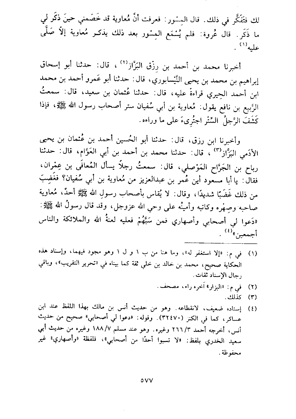 أَخْبَرَنا مُحَمَّدُ بْنُ أَحْمَد بْن رزق البزاز، قَالَ: حَدَّثَنا أَبُو إِسْحَاق إِبْرَاهِيم بْن مُحَمَّدِ بْن يَحْيَى النيسابوري، قَالَ: حَدَّثَنا أَبُو عَمْرو أحمد بْن مُحَمَّدِ بْن أَحْمَد الحيري قراءة عليه، قَالَ: حَدَّثَنا عثمان بْن سعيد، قَالَ: سمعت الربيع بْن نافع، يقول: معاوية بْن أَبِي سفيان ستر أصحاب رسول الله صَلَّى اللَّهُ عَلَيْهِ وَسَلَّمَ فإذا كشف الرجل الستر اجترئ على ما وراءه.