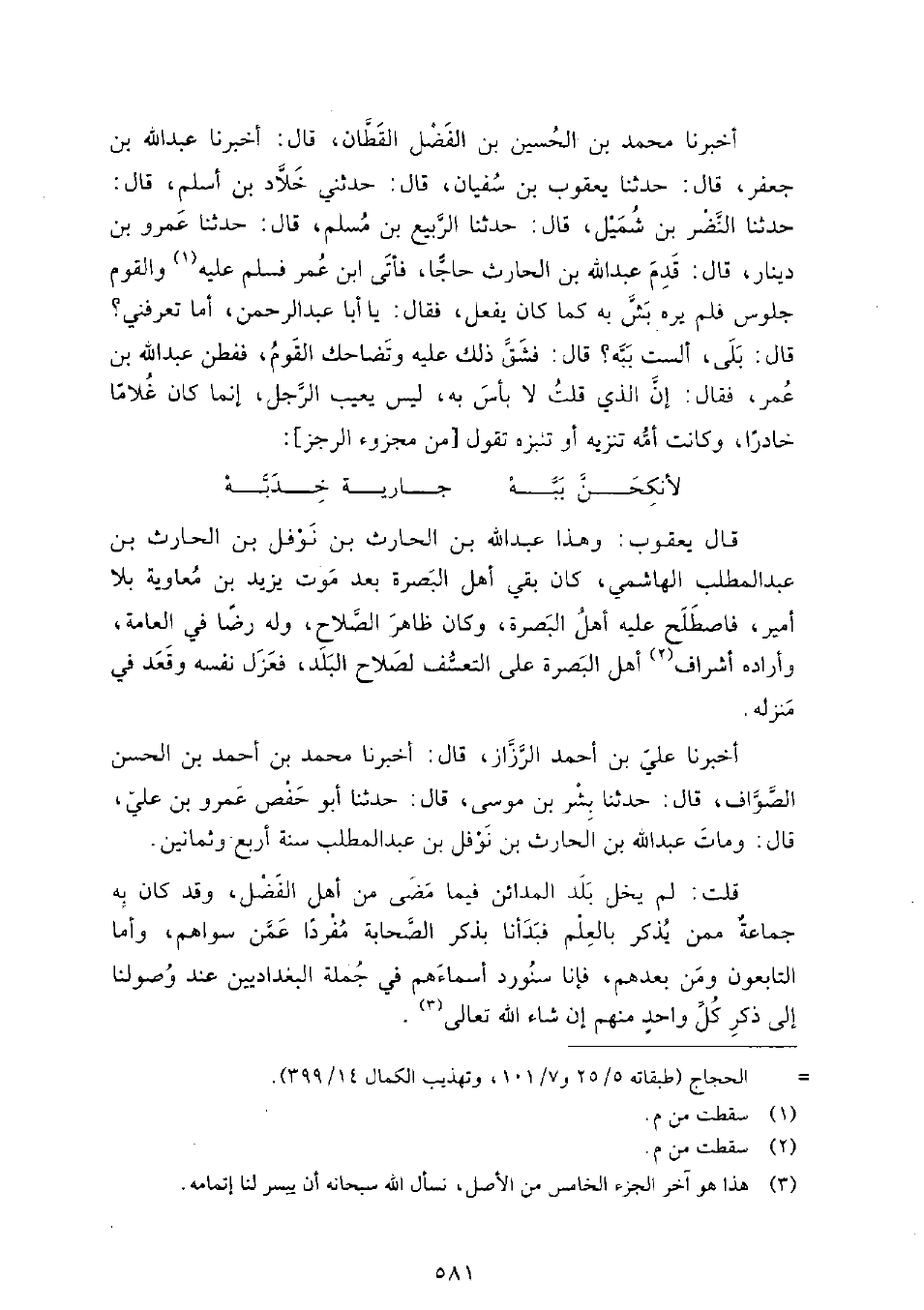أَخْبَرَنا مُحَمَّدُ بْنُ الْحُسَيْنِ بْن الفضل القطان، قَالَ: أَخْبَرَنَا عَبْدُ اللَّهِ بْنُ جَعْفَرٍ، قَالَ: حَدَّثَنا يعقوب بْن سفيان، قَالَ: حَدَّثَنِي خلاد بْن أسلم، قَالَ: حَدَّثَنا النضر بْن شميل، قَالَ: حَدَّثَنا الربيع بْن مسلم، قَالَ: حَدَّثَنا عمرو بْن دينار، قَالَ: قدم عَبْد اللَّهِ بْن الحارث حاجا، فأتى ابْن عُمَر فسلم عليه، والقوم جلوس، فلم يره بش به كما كان يفعل، فقال: يا أبا عَبْد الرَّحْمَنِ، أما تعرفني؟ قَالَ: بلى، ألست بَبَّه؟ قَالَ: فشق ذلك عليه وتضاحك القوم، ففطن عَبْد اللَّهِ بْن عُمَر، فقال: إن الذي قلت لا بأس به، ليس يعيب الرجل، إنما كان غلاما خادرا، وكانت أمه تنزيه أو تنبزه تقول: