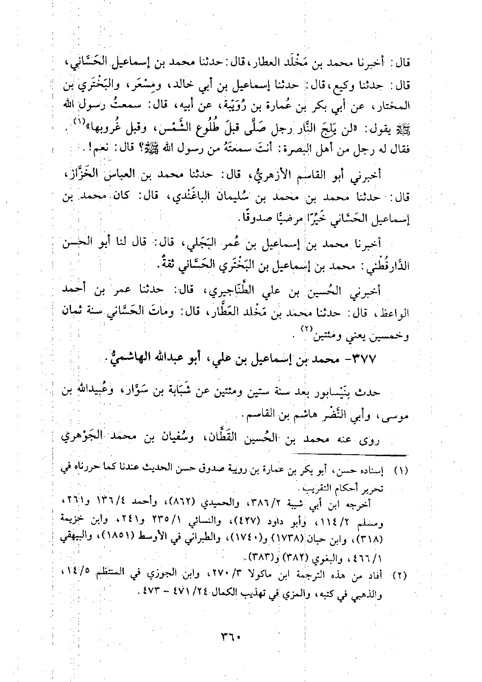 377 - محمد بن إسماعيل بن علي أبو عبد الله الهاشمي حدث بنيسابور بعد سنة ستين ومائتين عن شبابة بن سوار، وعبيد الله بن موسى، وأبى النضر هاشم بن القاسم.