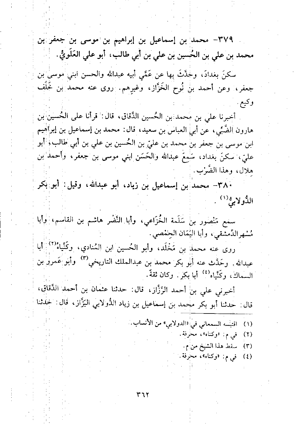 380 - محمد بن إسماعيل بن زياد أبو عبد الله وقيل أبو بكر الدولابي سمع منصور بن سلمة الخزاعي، وأبا النضر هاشم بن القاسم، وأبا مسهر الدمشقي، وأبا اليمان الحمصي.