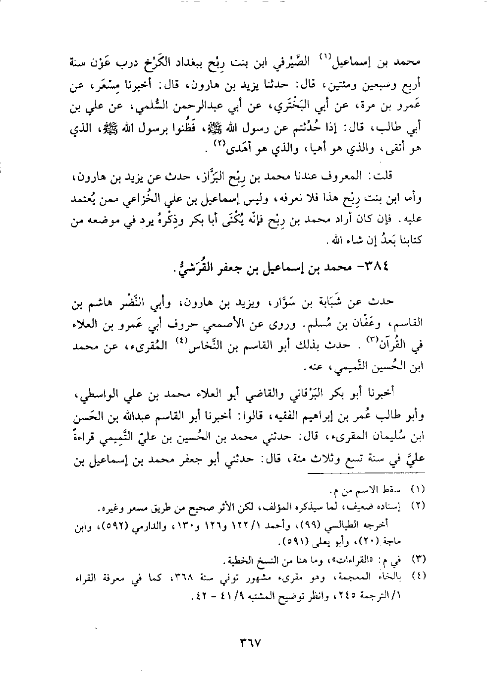 384 - محمد بن إسماعيل بن جعفر أبو جعفر القرشي حدث عن شبابة بن سوار، ويزيد بن هارون، وأبي النضر هاشم بن القاسم، وعفان بن مسلم.
