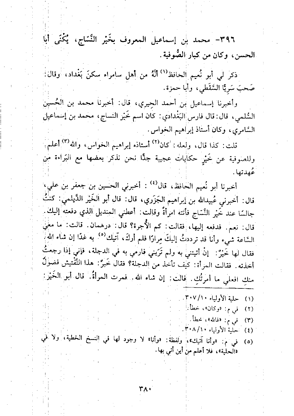 396 - محمد بن إسماعيل المعروف بخير النساج يكنى أبا الحسن وكان من كبار الصوفية، ذكر لي أبو نعيم الحافظ أنه من أهل سامراء سكن بغداد، وَقَالَ: صحب سريا السقطي، وأبا حمزة.