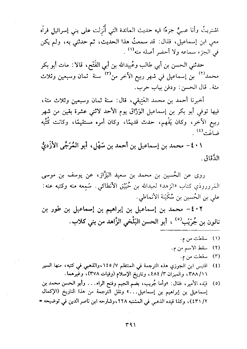 401 - محمد بن إسماعيل بن أحمد بن سهل أبو المرجى الأزدي الدقاق روى عن الحسين بن محمد بن سعيد البزاز، عن يوسف بن موسى المروروذي كتاب " الزهد " لعبد الله بن حبيق الأنطاكي سمعه منه وكتبه عنه: علي بن الحسين بن سكينة الأنماطي.