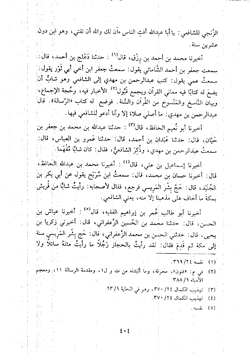 أَخْبَرَنَا أبو نعيم الحافظ، قَالَ: حدثنا أحمد بن بندار بن إسحاق، قَالَ: حدثنا أبو الطيب أحمد بن روح البغدادي، قَالَ: حدثنا الحسن بن محمد الزعفراني، قَالَ: قدم علينا الشافعي بغداد سنة خمس وتسعين ومائة، فأقام عندنا سنتين، ثم خرج إلى مكة، ثم قدم علينا سنة ثمان وتسعين فأقام عندنا أشهرا، ثم خرج، وكان يخضب بالحناء، وكان خفيف العارضين.