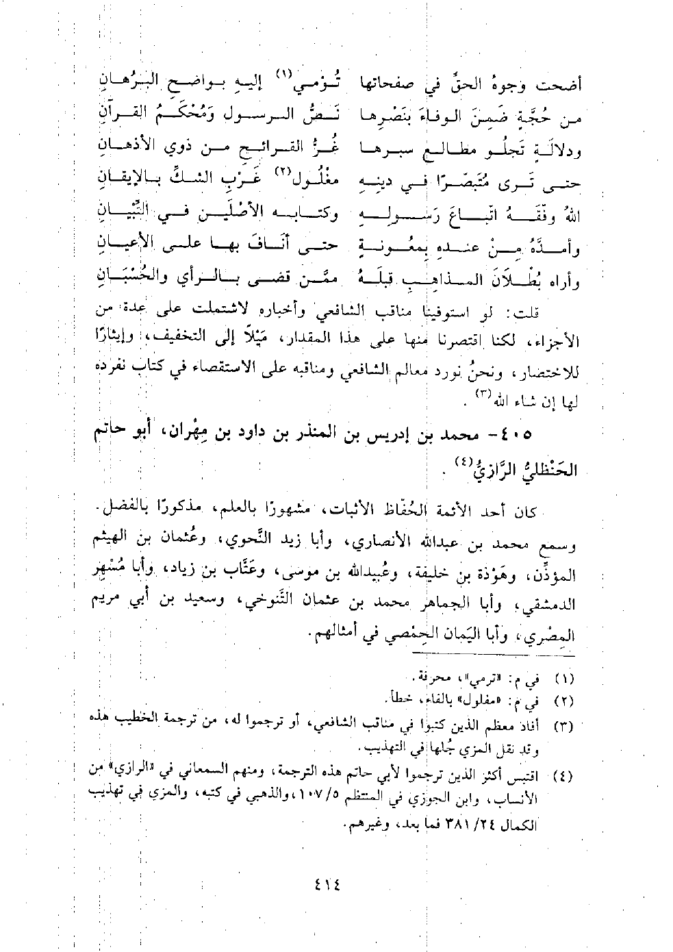 405 - محمد بن إدريس بن المنذر بن داود بن مهران أبو حاتم الحنظلي الرازي كان أحد الأئمة الحفاظ الأثبات، مشهورا بالعلم، مذكورا بالفضل.