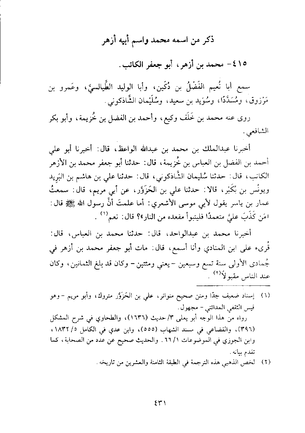 415 - محمد بن أزهر أبو جعفر الكاتب سمع أبا نعيم الفضل بن دكين، وأبا الوليد الطيالسي، وعمرو بن مرزوق، ومسددا، وسويد بن سعيد، وسليمان الشاذكوني.