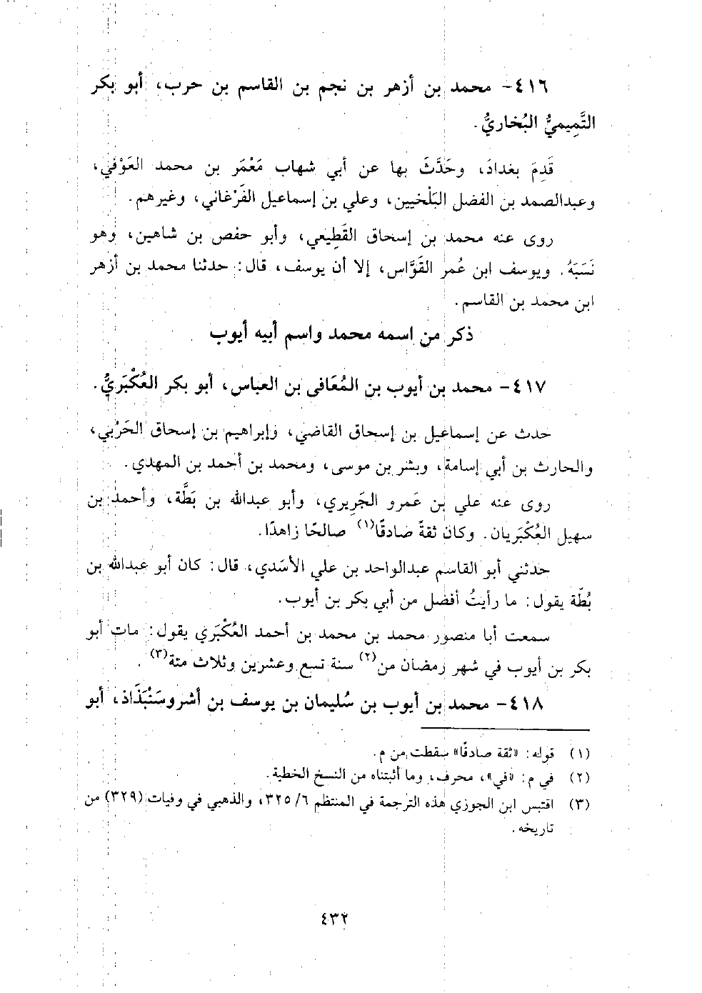 417 - محمد بن أيوب بن المعافى بن العباس أبو بكر العكبري حدث عن إسماعيل بن إسحاق القاضي، وإبراهيم بن إسحاق الحربي، والحارث بن أبي أسامة، وبشر بن موسى، ومحمد بن أحمد بن المهدي.