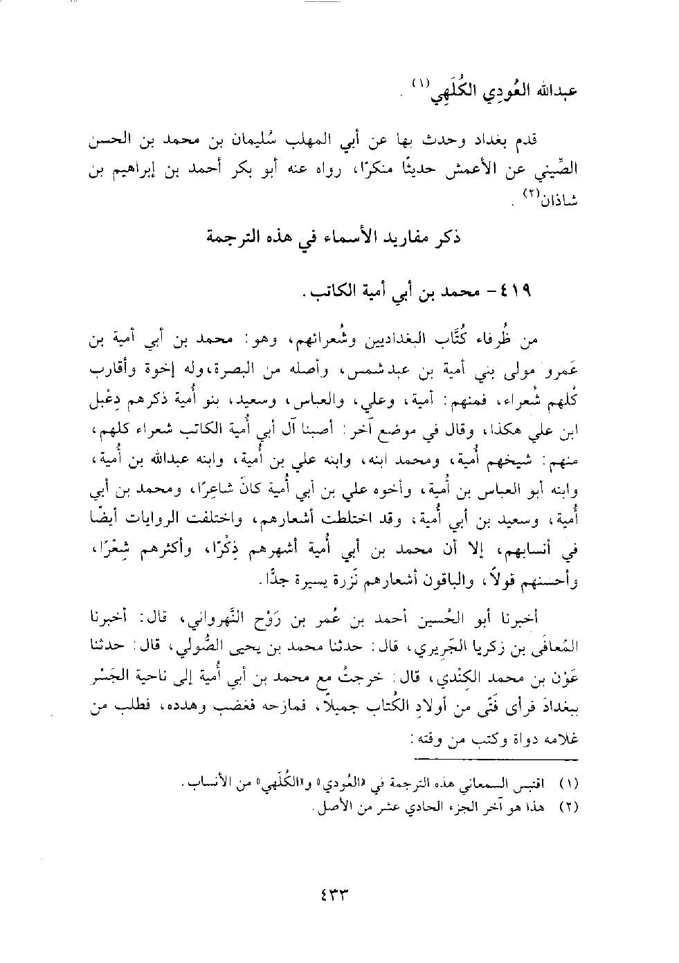 419 - محمد بن أبي أمية الكاتب من ظرفاء كتاب البغداديين وشعرائهم، وهو: محمد بن أبي أمية بن عمرو مولى بني أمية بن عبد شمس، وأصله من البصرة، وله إخوة وأقارب كلهم شعراء، فمنهم: أمية، وعلى، والعباس، وسعيد، بنو أمية ذكرهم دعبل بن علي هكذا، وَقَالَ في موضع آخر: أصبنا آل أبي أمية الكاتب شعراء كلهم، منهم: شيخهم أمية، ومحمد ابنه، وابنه علي بن أمية، وابنه عبد الله بن أمية، وابنه أبو العباس بن أمية، وأخوه علي بن أبي أمية، كان شاعرا، ومحمد بن أبي أمية، وسعيد بن أبي أمية، وقد اختلطت أشعارهم، واختلفت الروايات أيضا في أنسابهم، إلا أن محمد بن أبي أمية أشهرهم ذكرا، وأكثرهم شعرا، وأحسنهم قولا، والباقون أشعارهم نزرة يسيرة جدا.